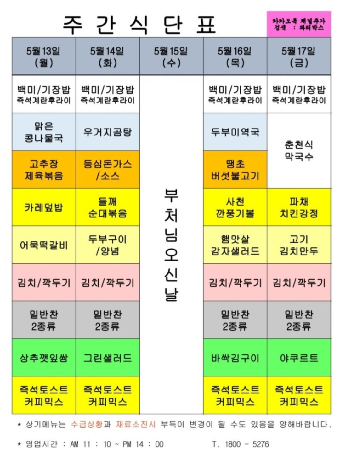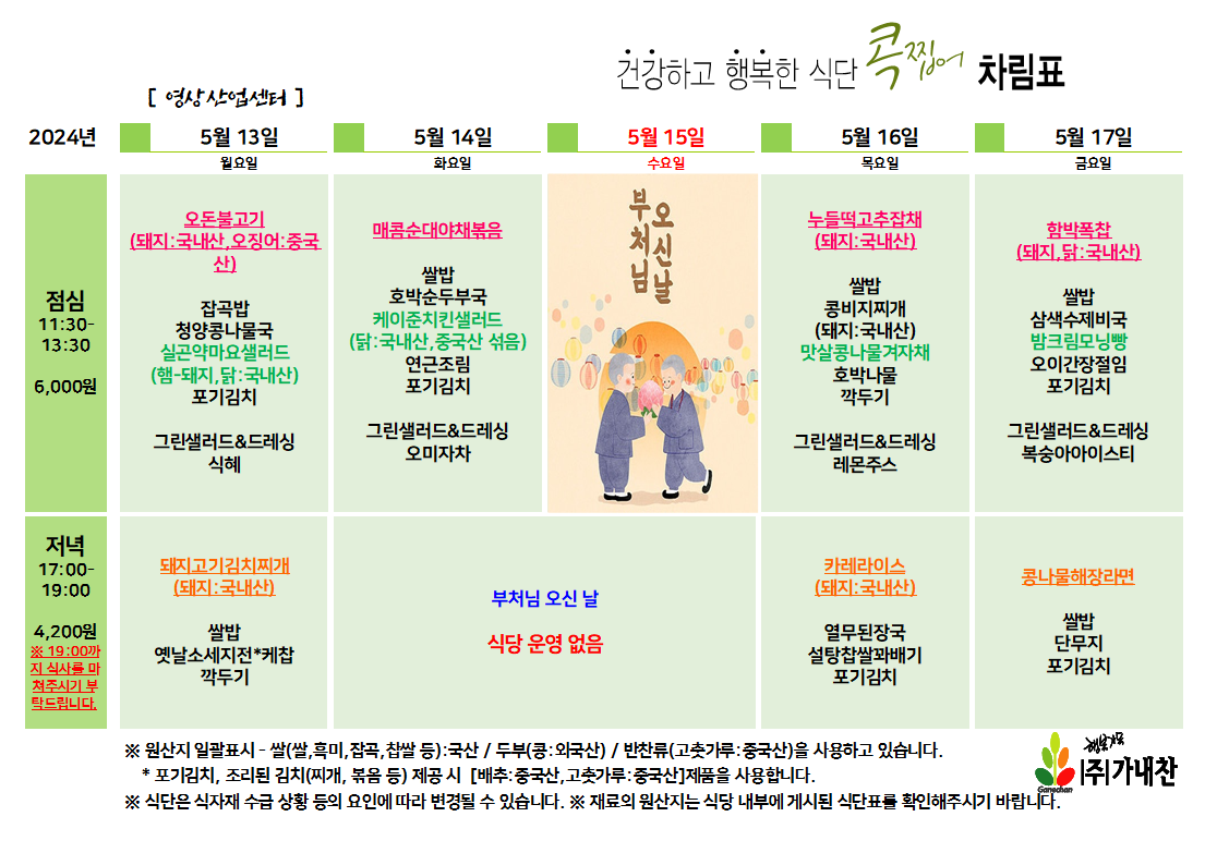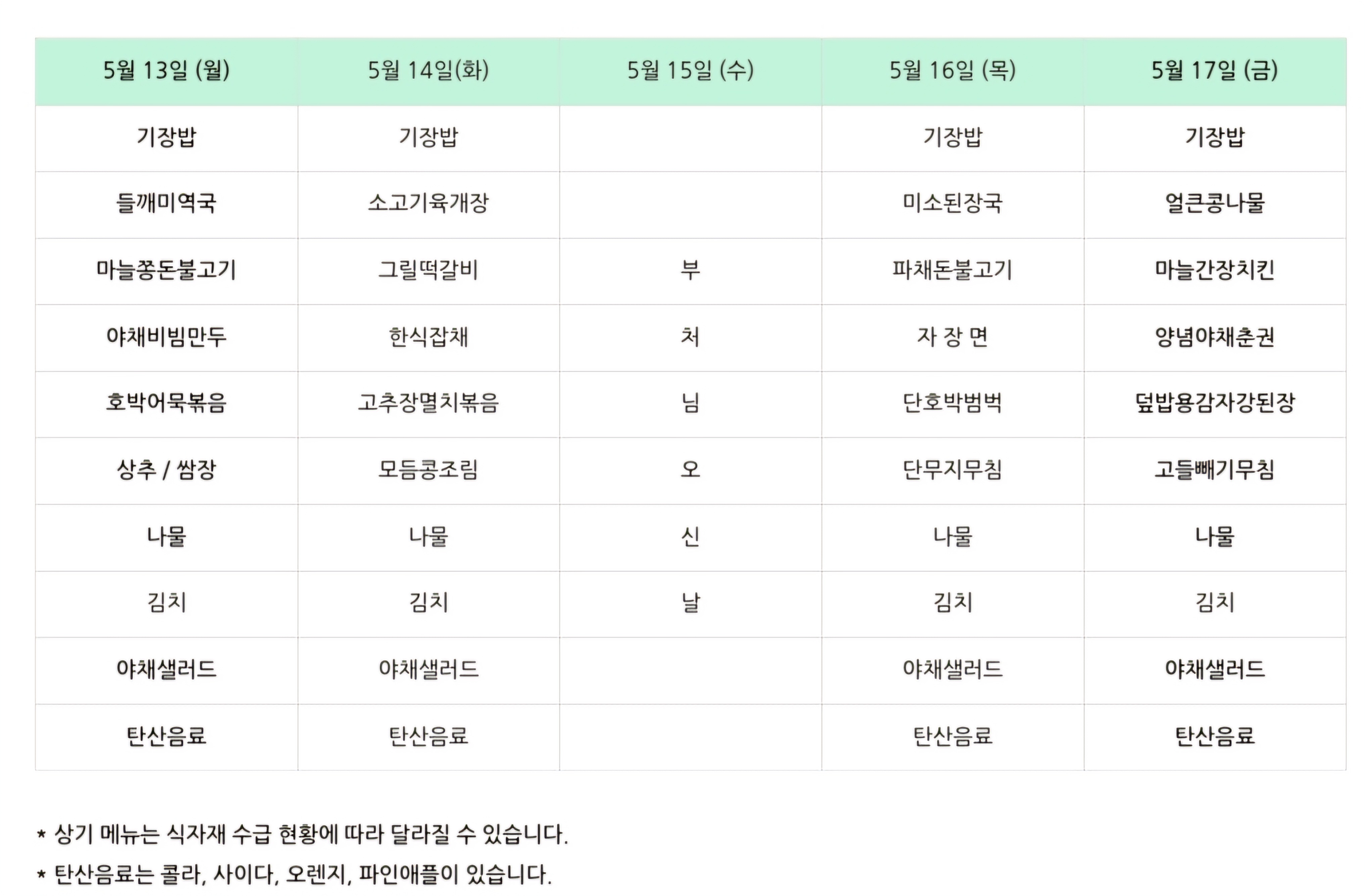 센텀시티 구내식당 식단표 2024년 [5월 13일 - 5월 17일] 주간