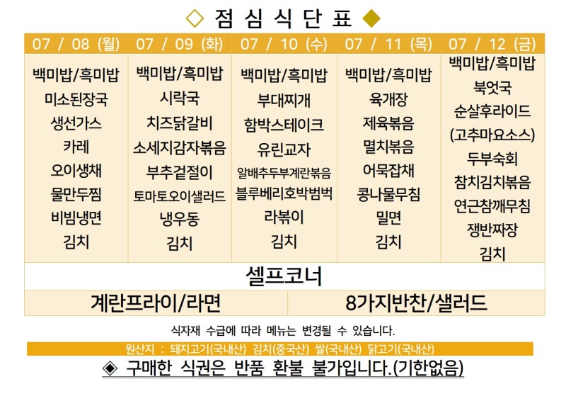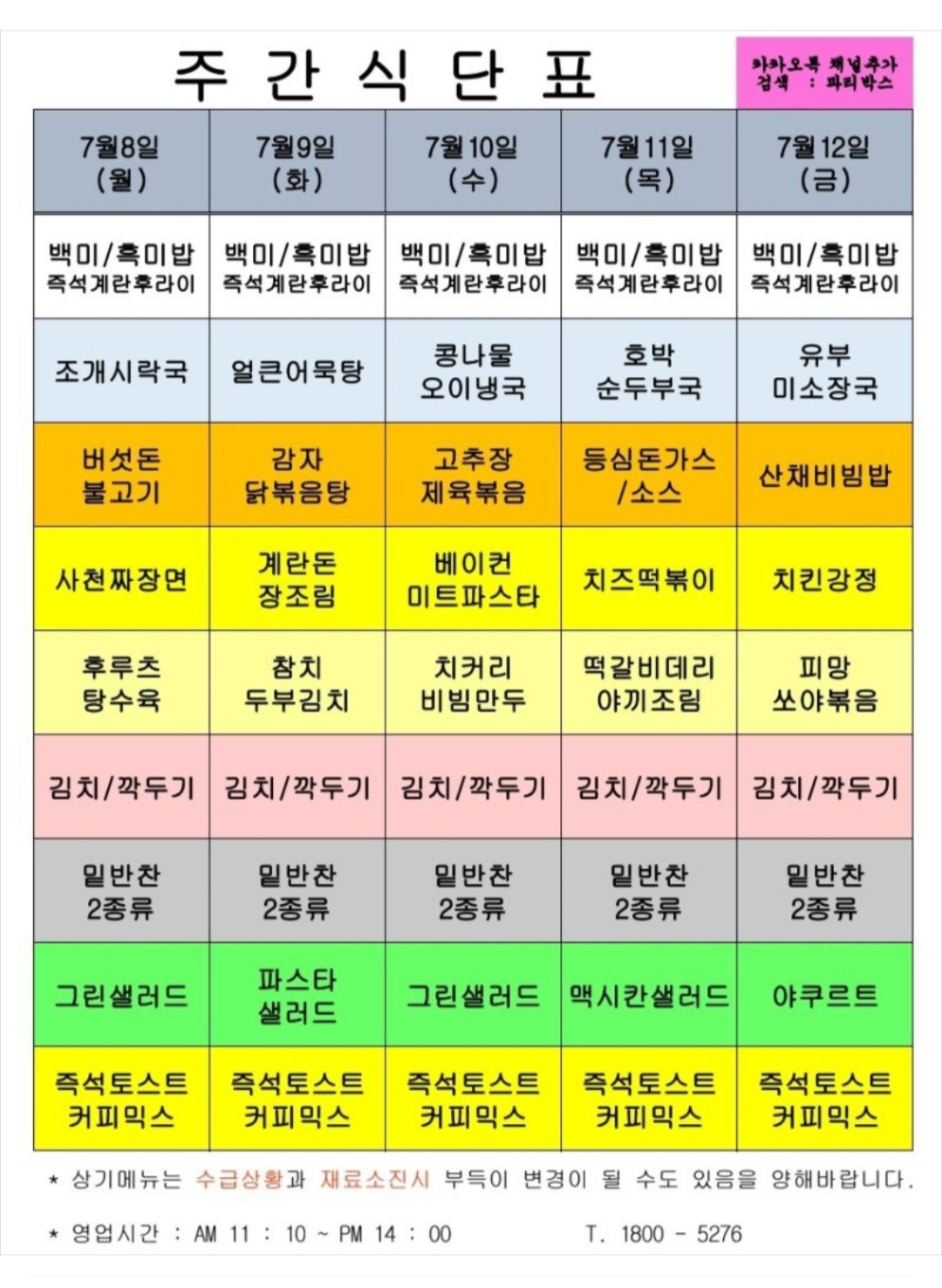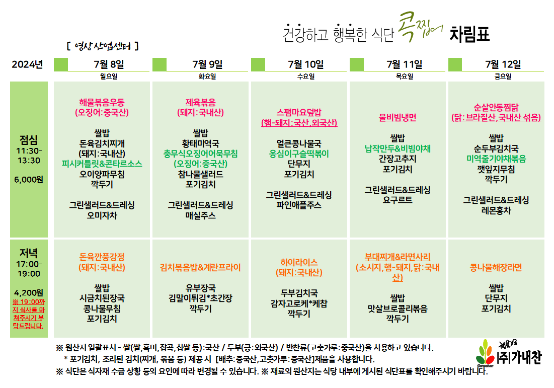 센텀시티 구내식당 식단표 2024년 [7월 1일 - 7월 5일] 주간 (0) | 2024.07.01 |
