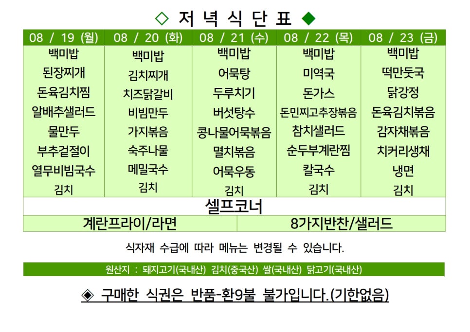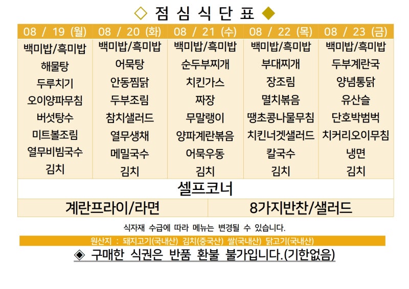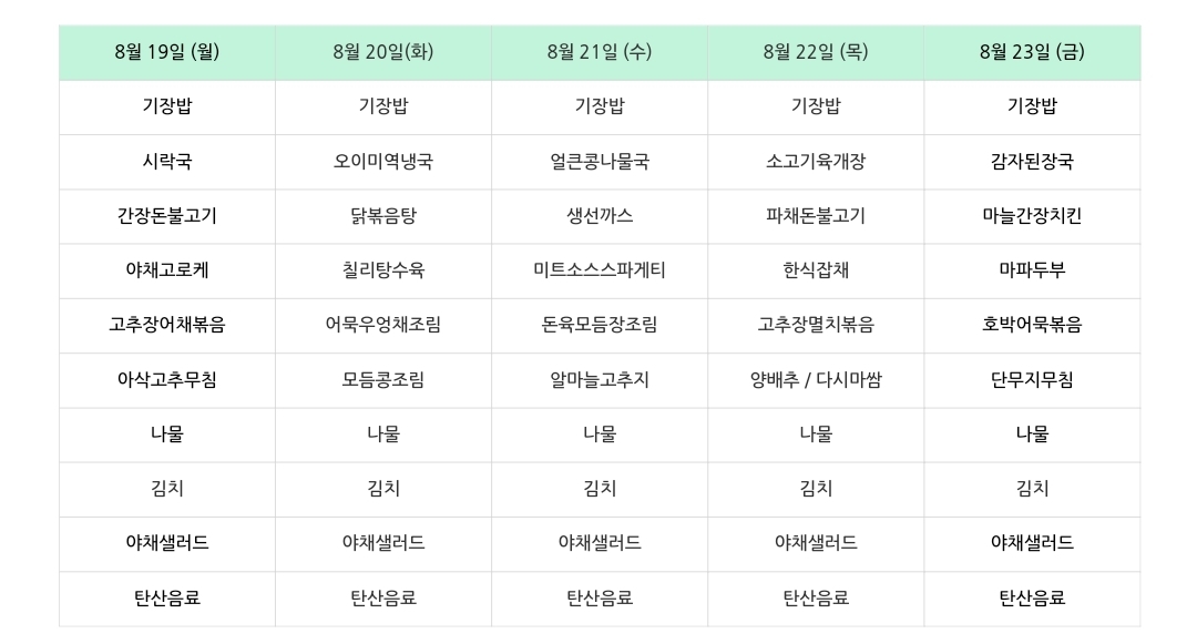 센텀시티 구내식당 식단표 2024년 [8월 19일 - 8월 23일] 주간