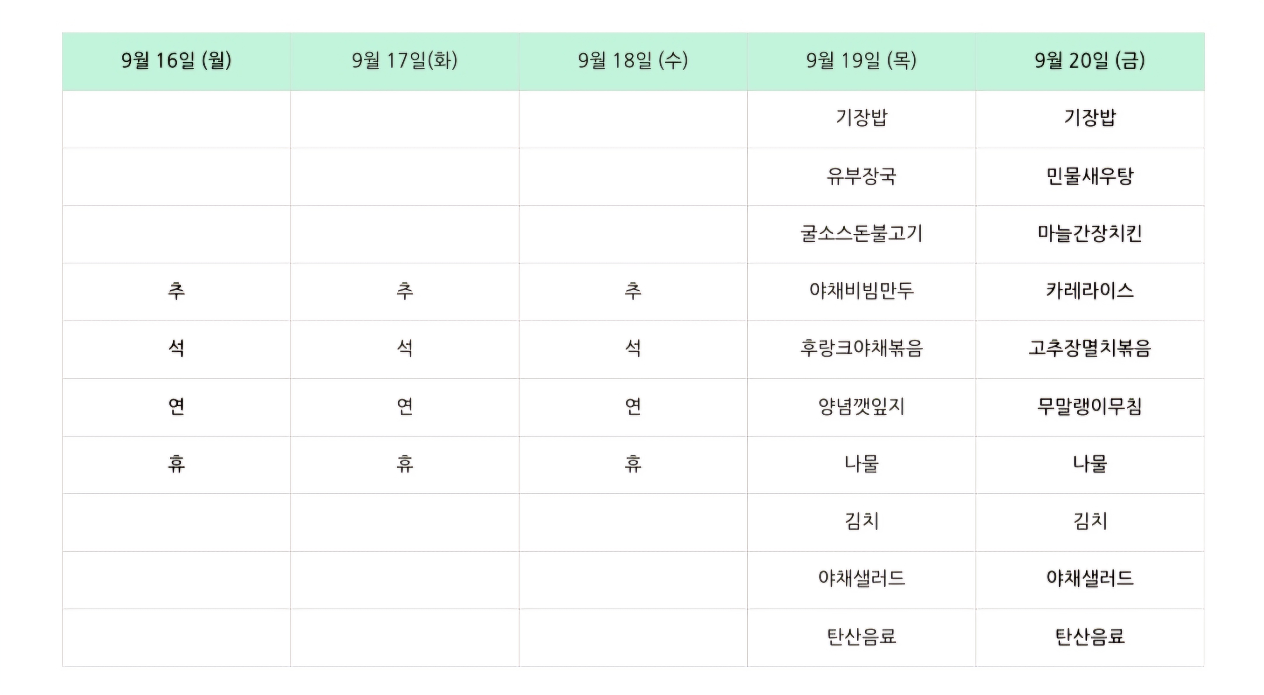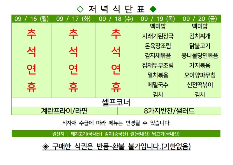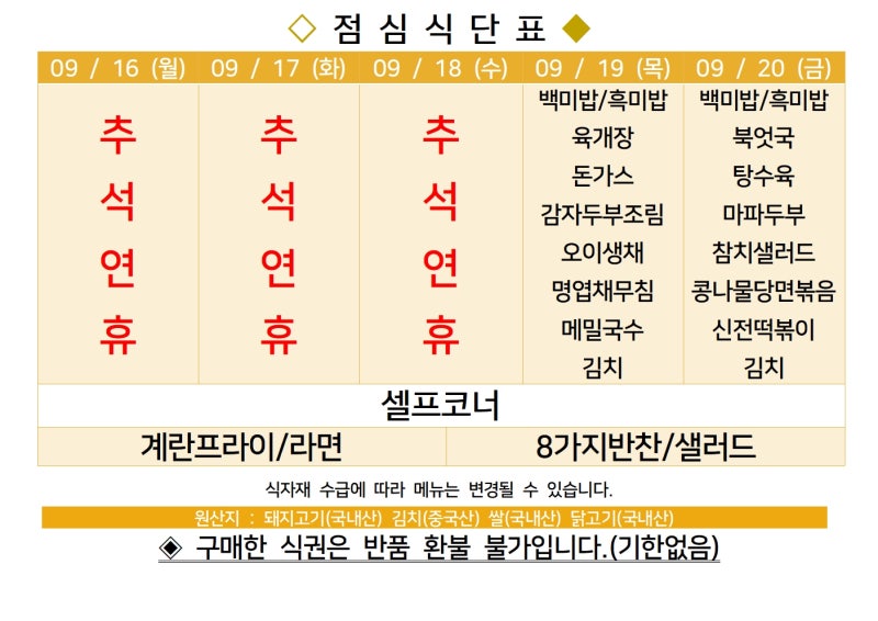 센텀시티 구내식당 식단표 2024년 [9월 19일 - 9월 20일] 주간