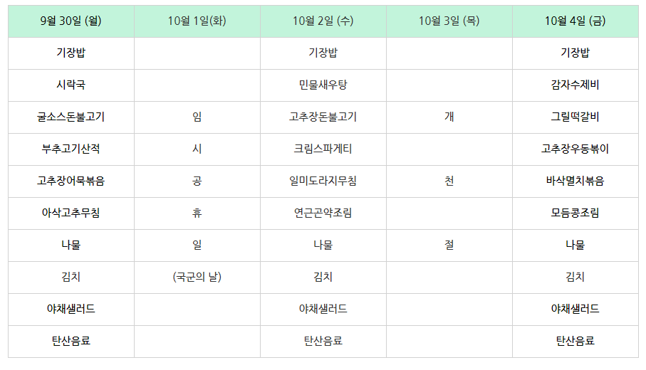 | 센텀시티 구내식당 식단표 2024년 [10월 7일 - 10월 12일] 주간 (1) | 2024.10.07 |
