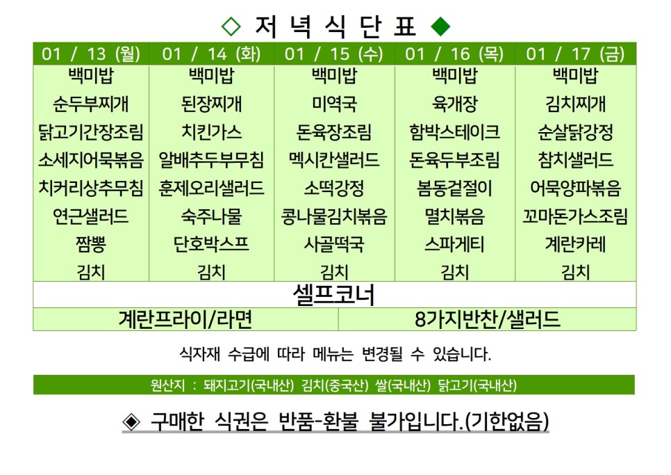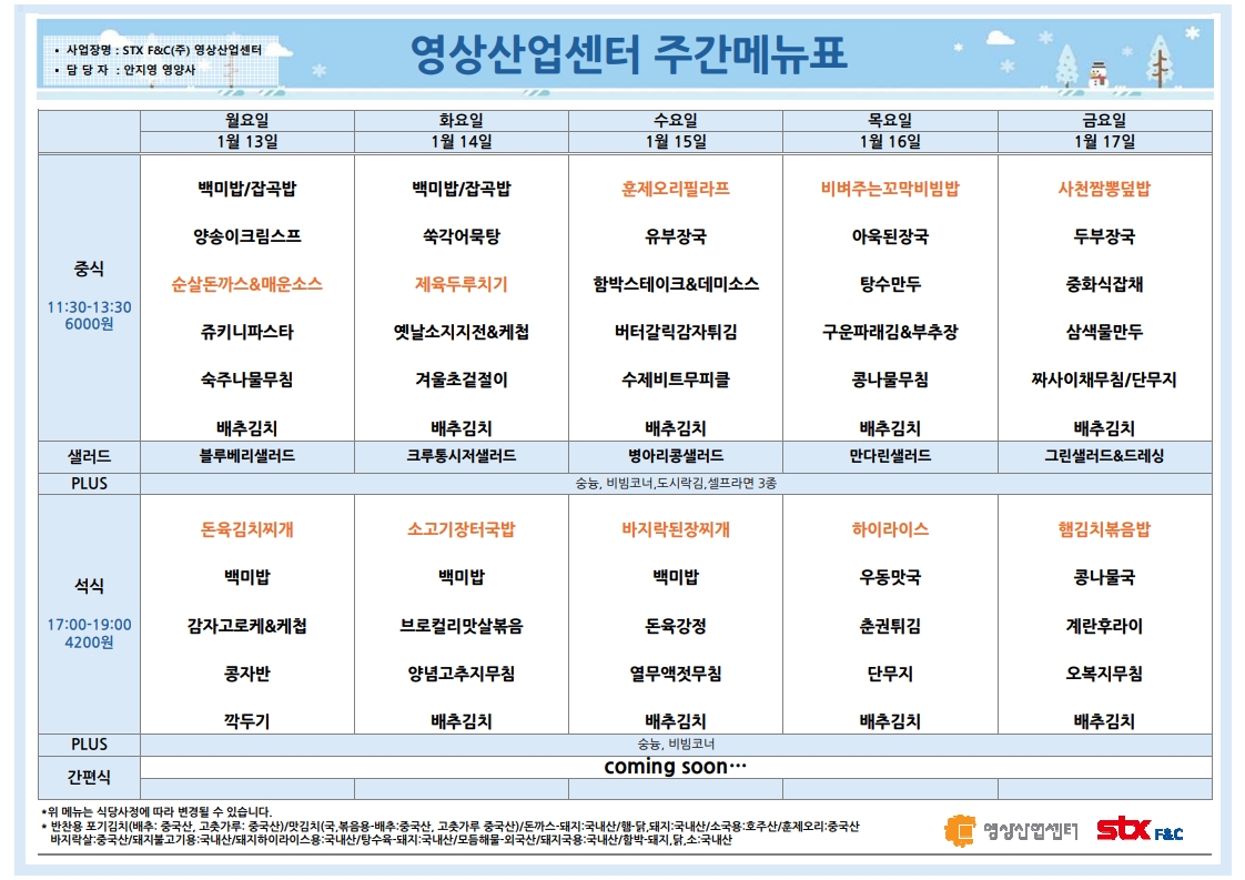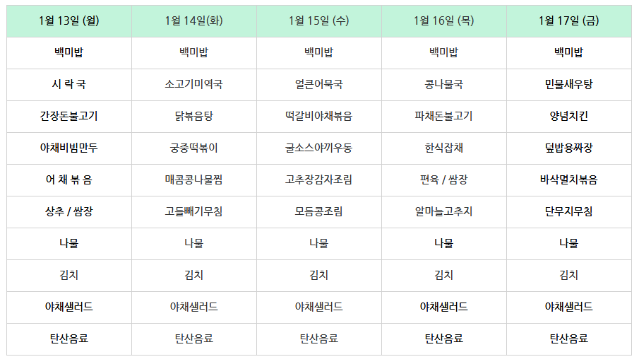 | 센텀시티 구내식당 식단표 2025년 [1월 6일 - 1월 10일] 주간 (0) | 2025.01.06 |
