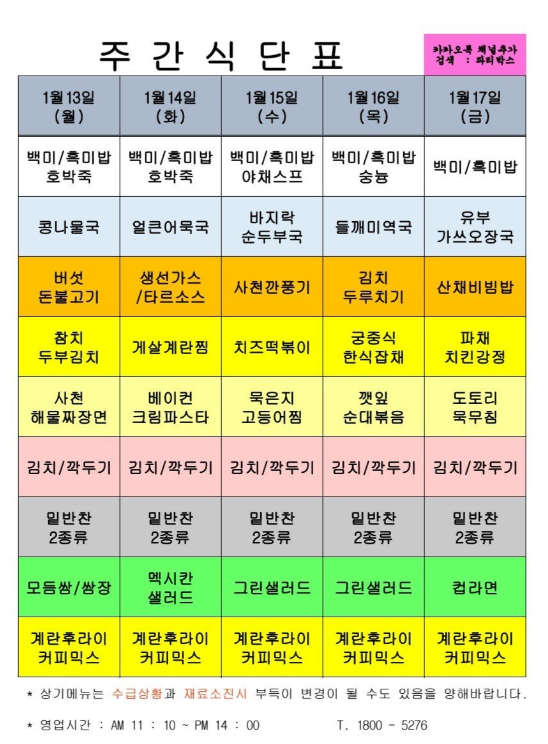 | 센텀시티 구내식당 식단표 2025년 [1월 20일 - 1월 24일] 주간 (1) | 2025.01.20 |