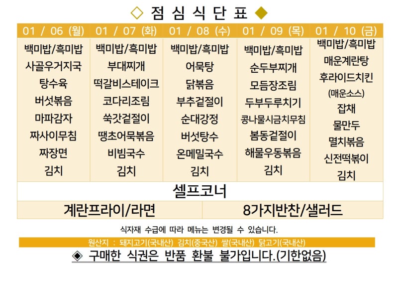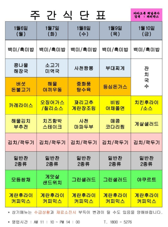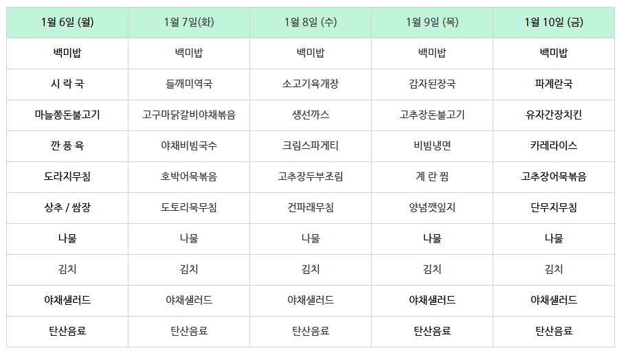 | 센텀시티 구내식당 식단표 2025년 [1월 13일 - 1월 17일] 주간 (1) | 2025.01.13 |