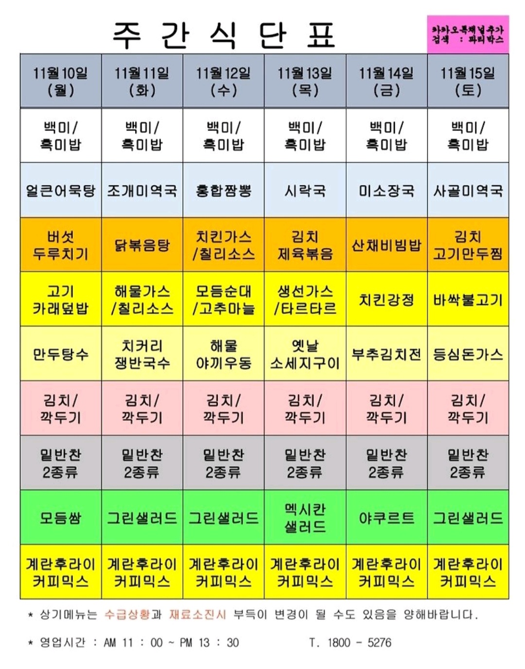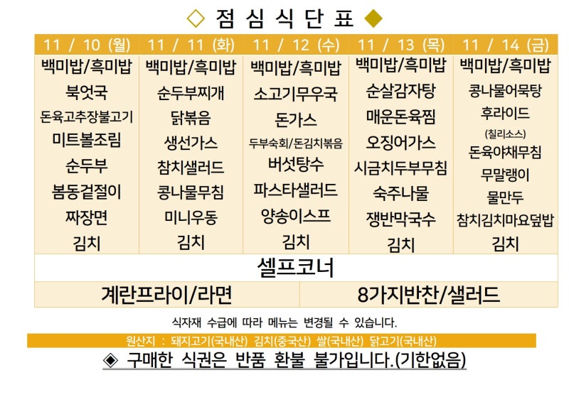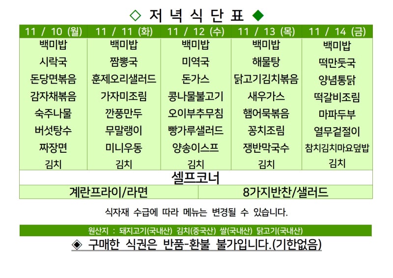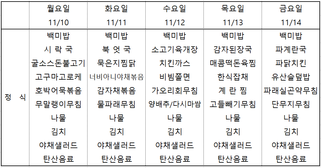 | 센텀시티 구내식당 식단표 2025년 [11월 3일~7일] 주간 (0) | 2025.11.03 |