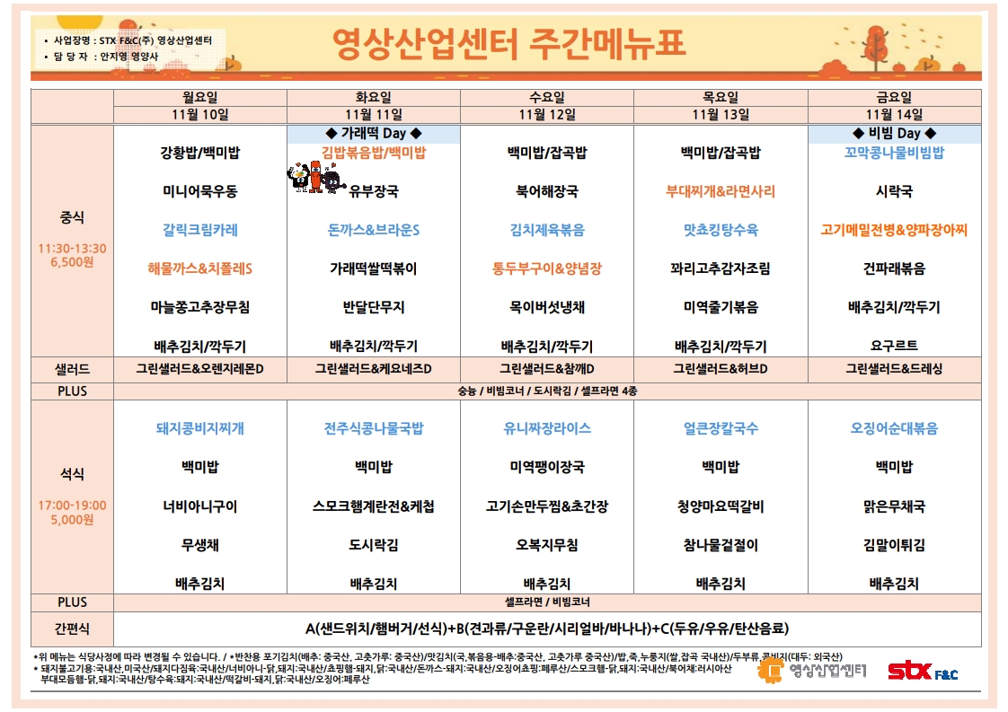 | 센텀시티 구내식당 식단표 2025년 [11월 17일~21일] 주간 (0) | 2025.11.17 |