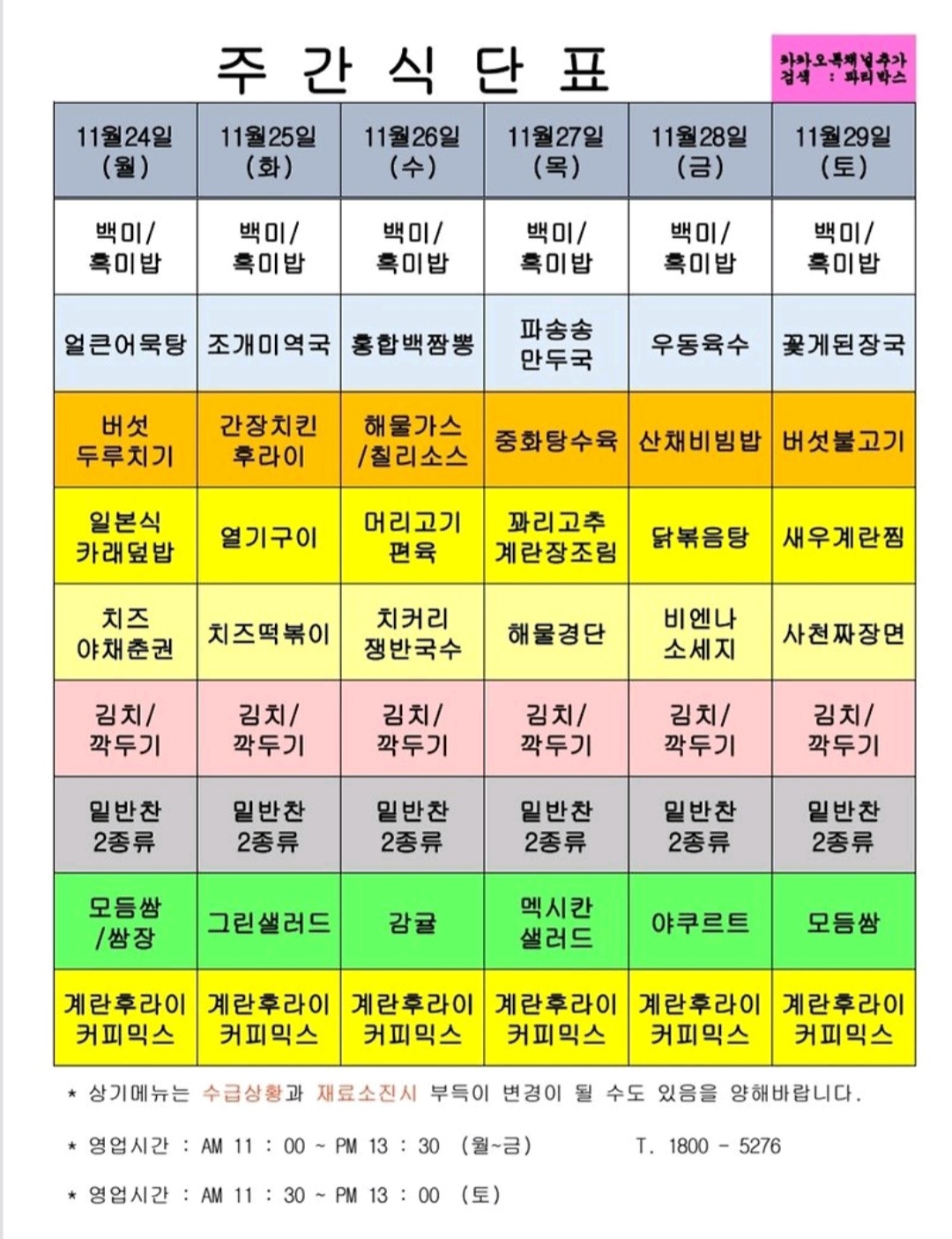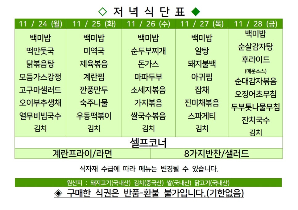 | 센텀시티 구내식당 식단표 2025년 [11월 3일~7일] 주간 (0) | 2025.11.03 |