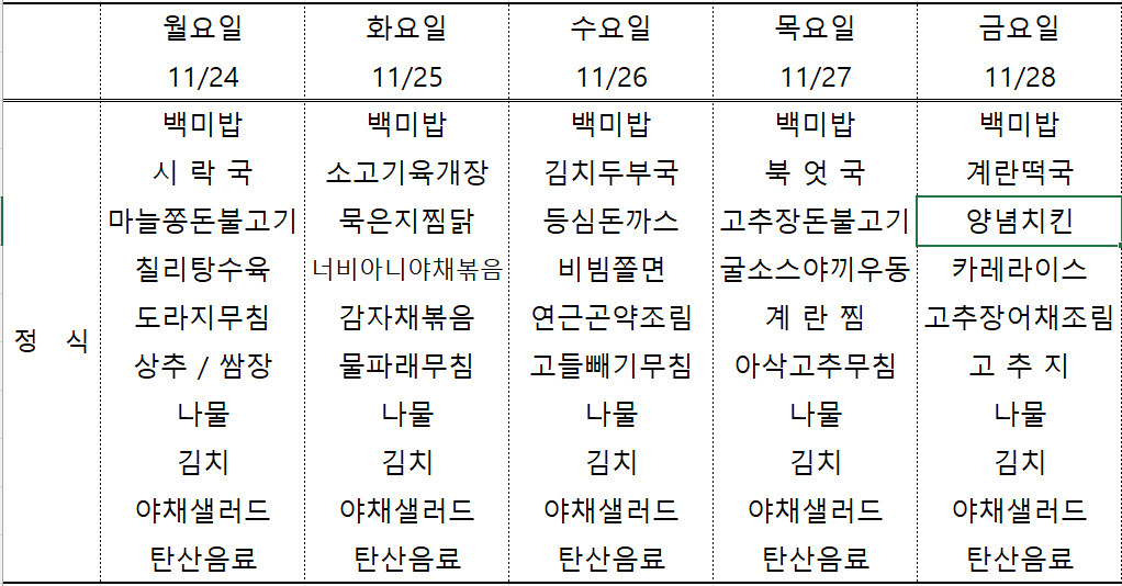 | 센텀시티 구내식당 식단표 2025년 [11월 17일~21일] 주간 (0) | 2025.11.17 |