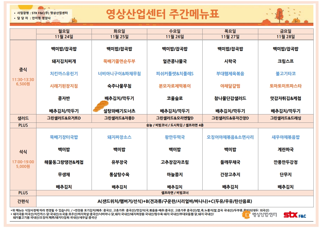| 센텀시티 구내식당 식단표 2025년 [11월 17일~21일] 주간 (0) | 2025.11.17 |