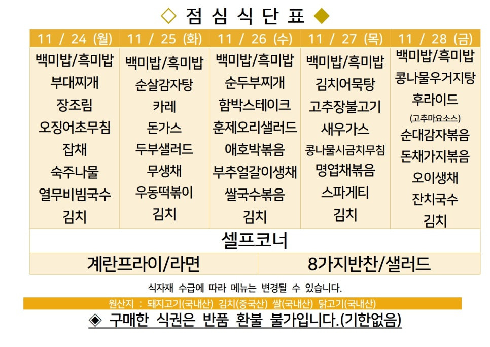 | 센텀시티 구내식당 식단표 2025년 [11월 3일~7일] 주간 (0) | 2025.11.03 |