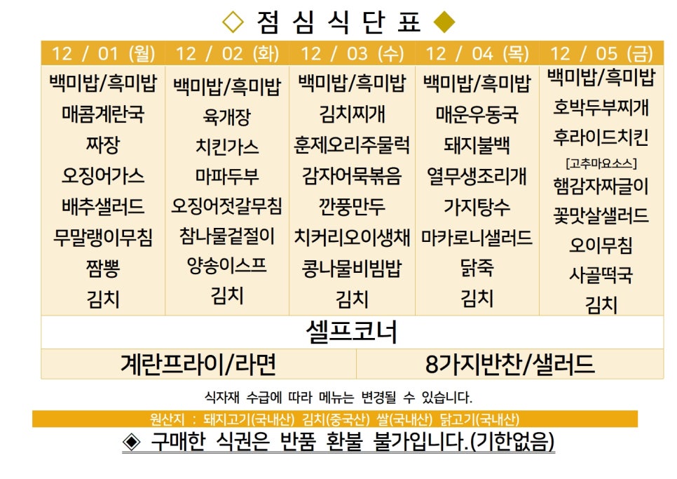 | 센텀시티 구내식당 식단표 2025년 [11월 3일~7일] 주간 (0) | 2025.11.03 |