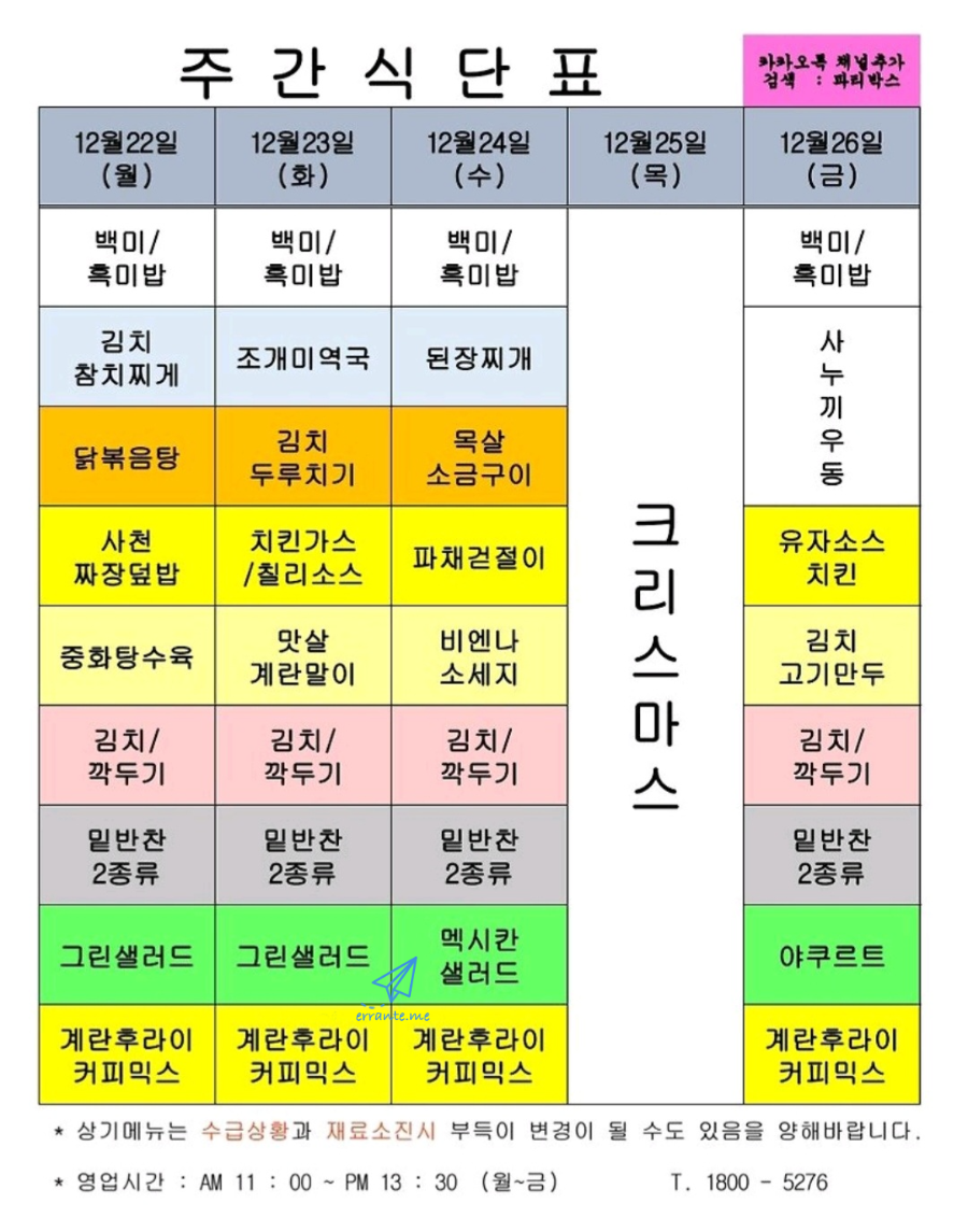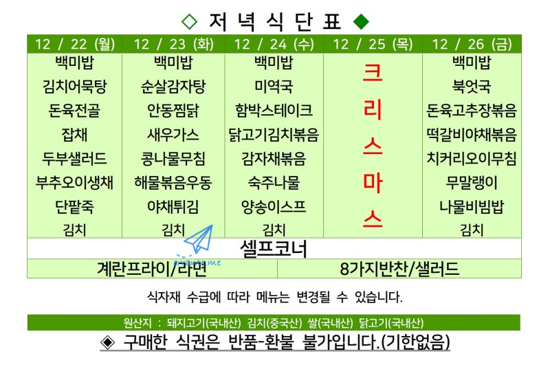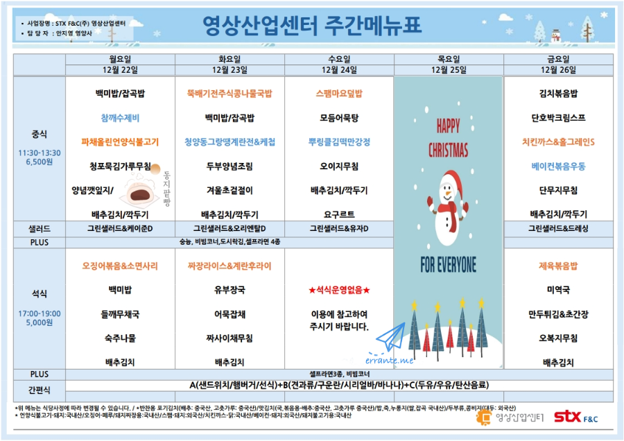 센텀시티 구내식당 식단표 2025년 [12월 22일 - 12월 26일] 주간