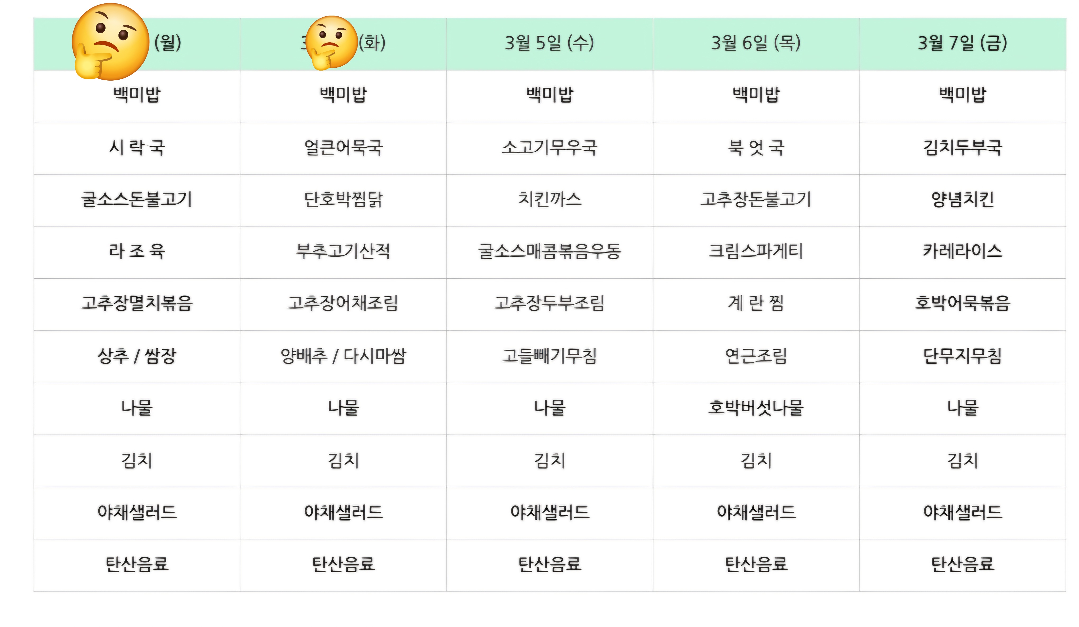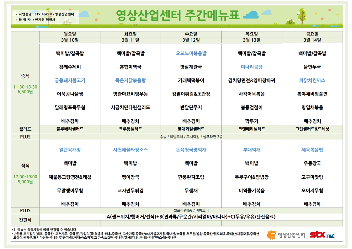 | 센텀시티 구내식당 식단표 2025년 [3월 17일 - 3월 21일] 주간 (0) | 2025.03.17 |