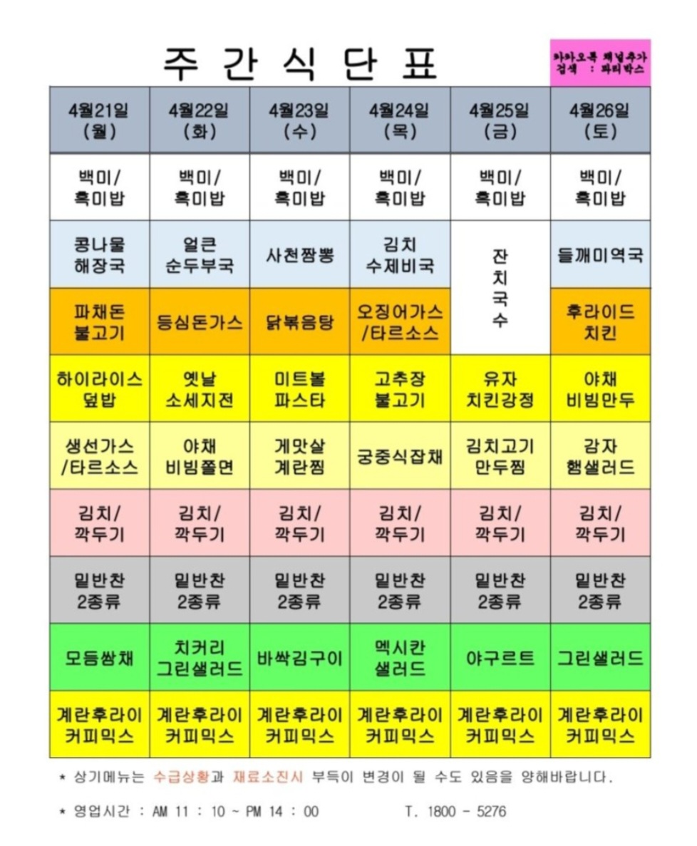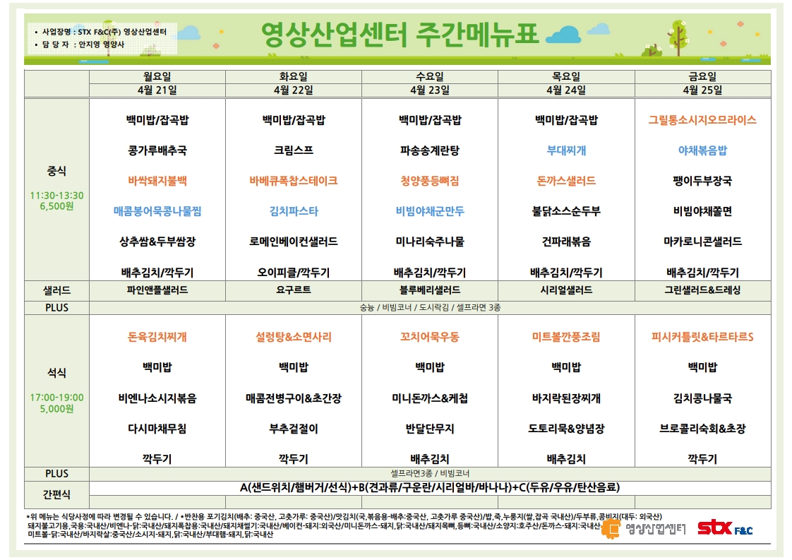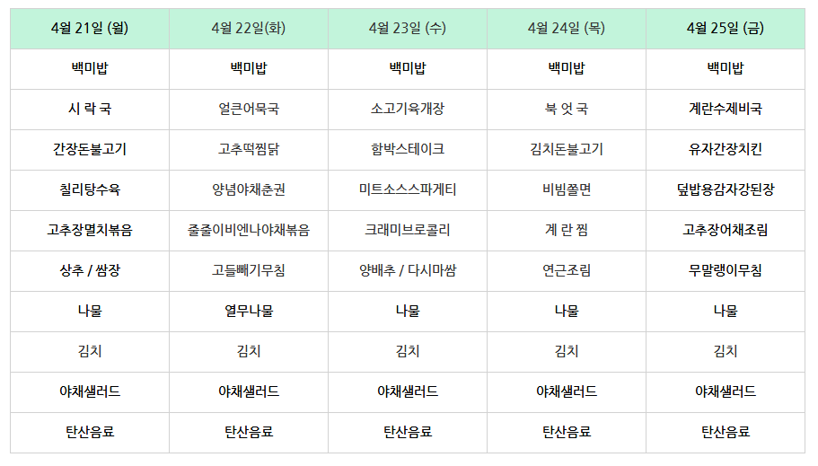 센텀시티 구내식당 식단표 2025년 [4월 7일 - 4월 11일] 주간 (2) | 2025.04.07 |