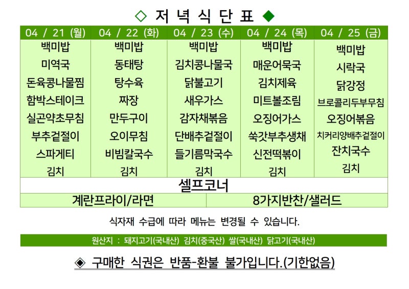 센텀시티 구내식당 식단표 2025년 [4월 28일 - 5월 2일] 주간 (1) | 2025.04.28 |