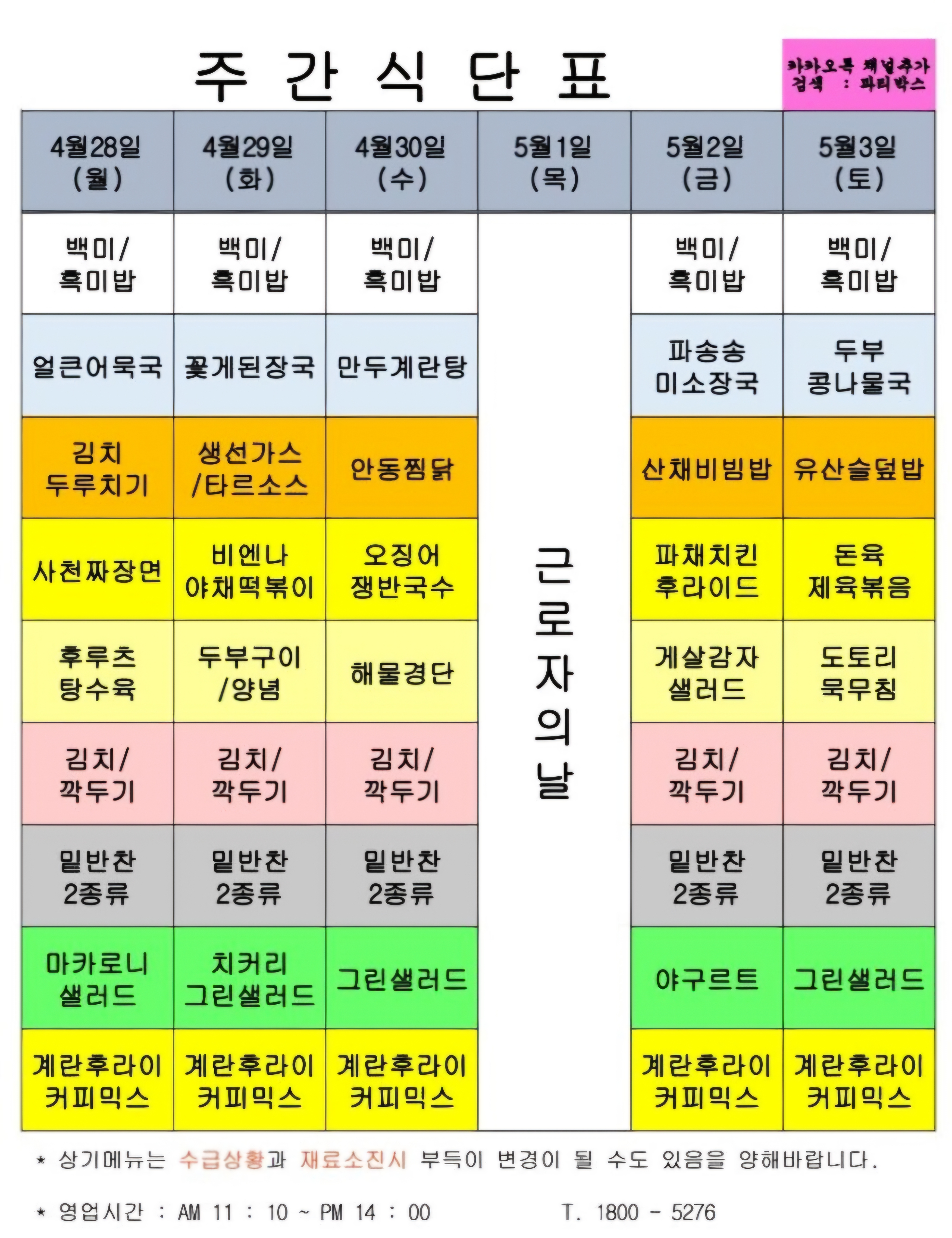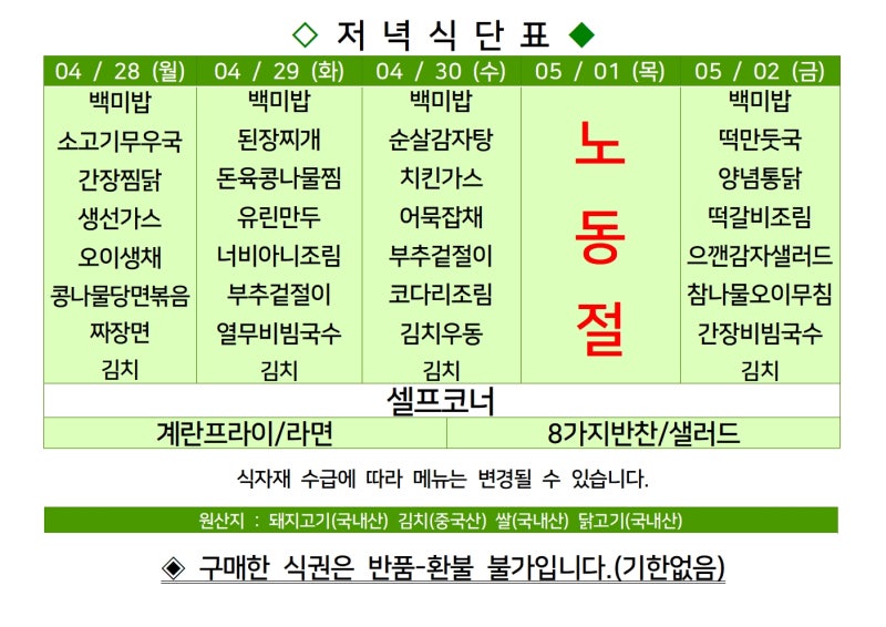 | 센텀시티 구내식당 식단표 2025년 [5월 7일 - 5월 9일] 주간 (2) | 2025.05.07 |