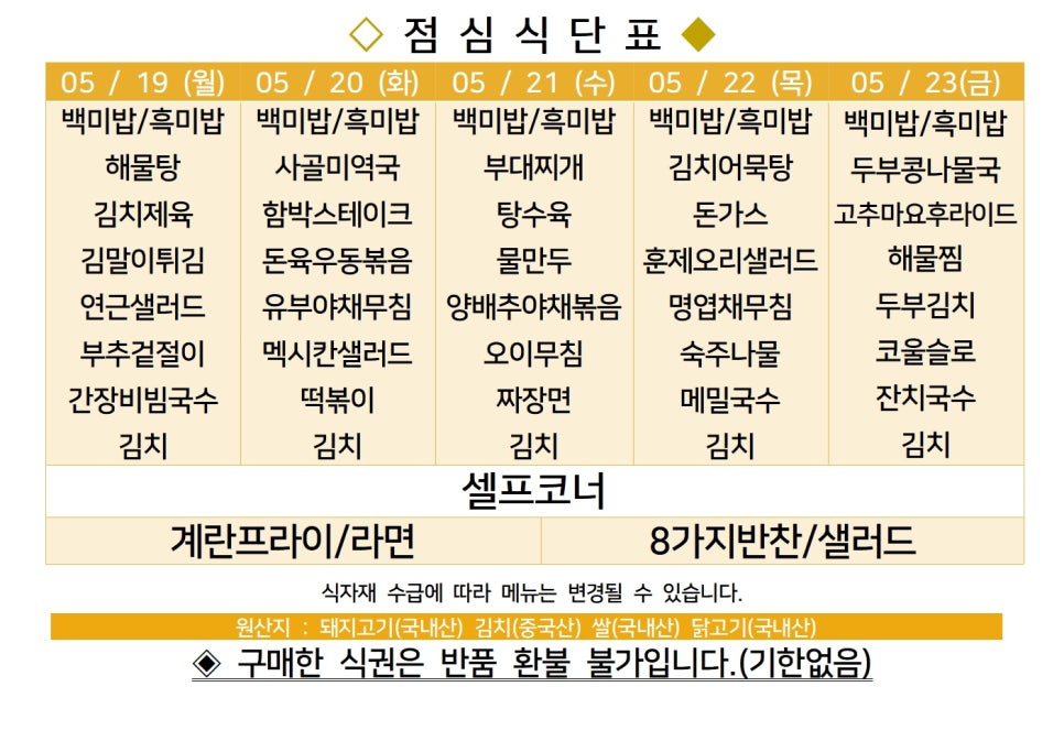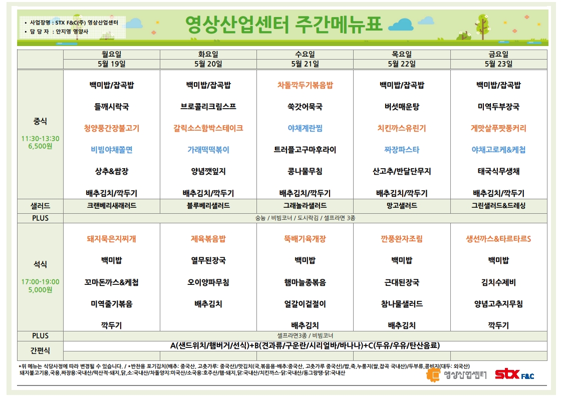 | 센텀시티 구내식당 식단표 2025년 [5월 12일 - 5월 16일] 주간 (0) | 2025.05.12 |