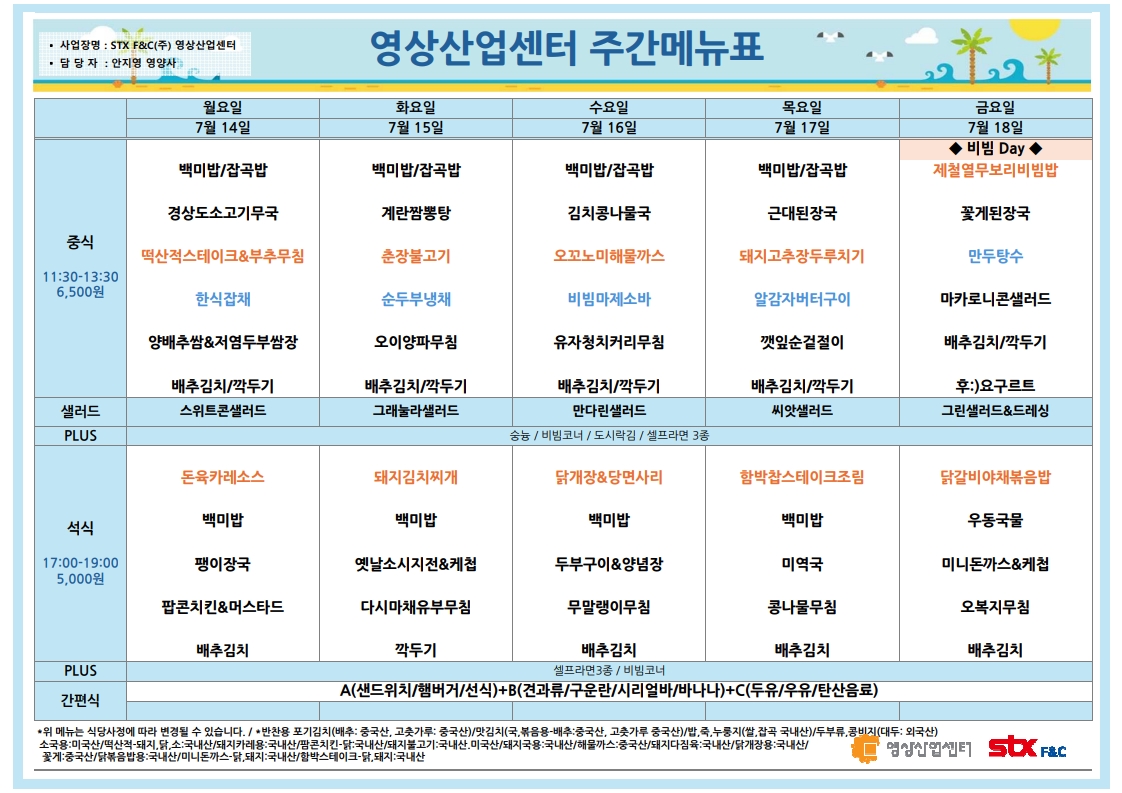 | 센텀시티 구내식당 식단표 2025년 [7월 14일 - 7월 18일] 주간 (0) | 2025.07.14 |