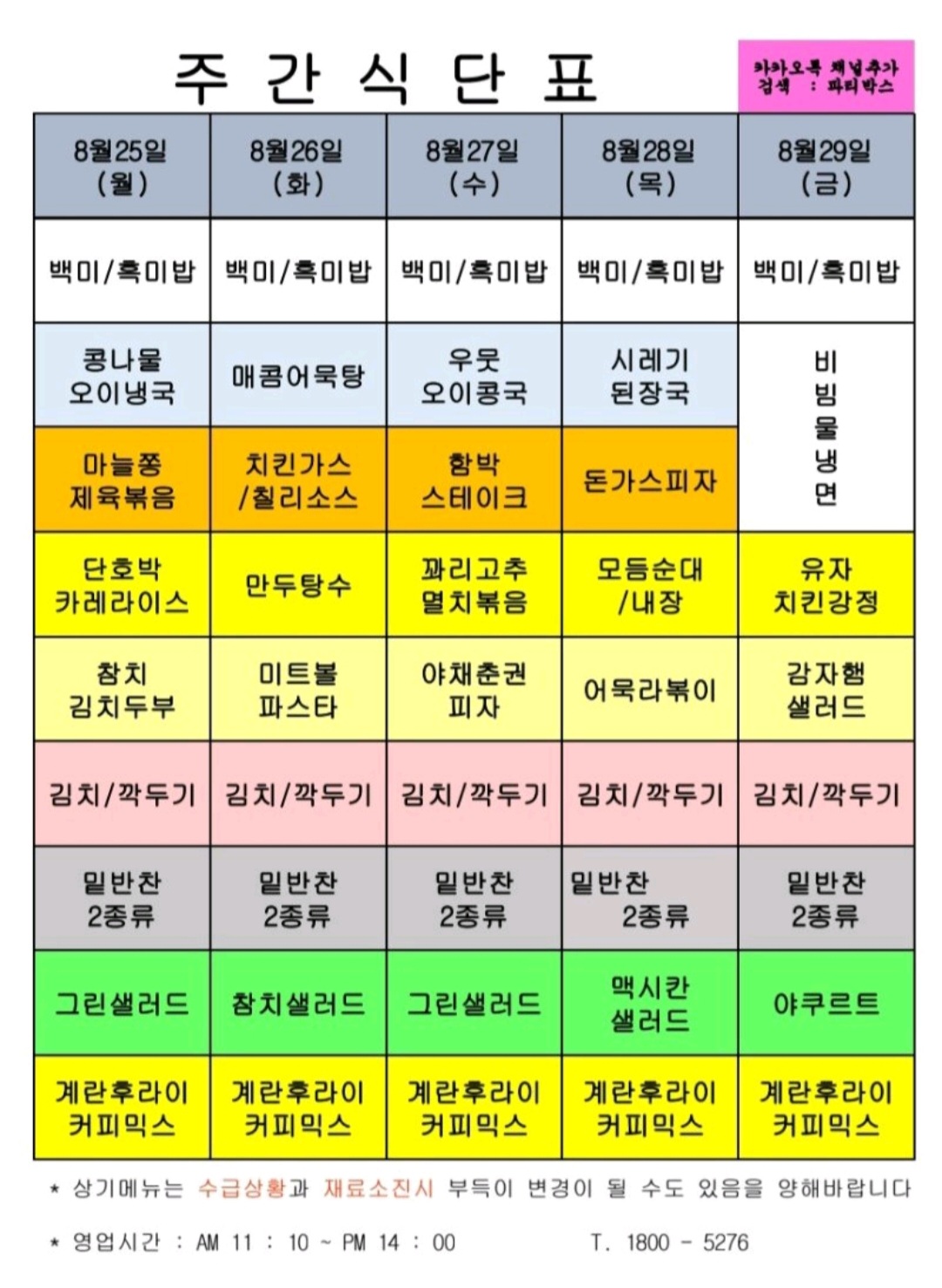 | 센텀시티 구내식당 식단표 2025년 [8월 11일 - 8월 14일] 주간 (4) | 2025.08.11 |