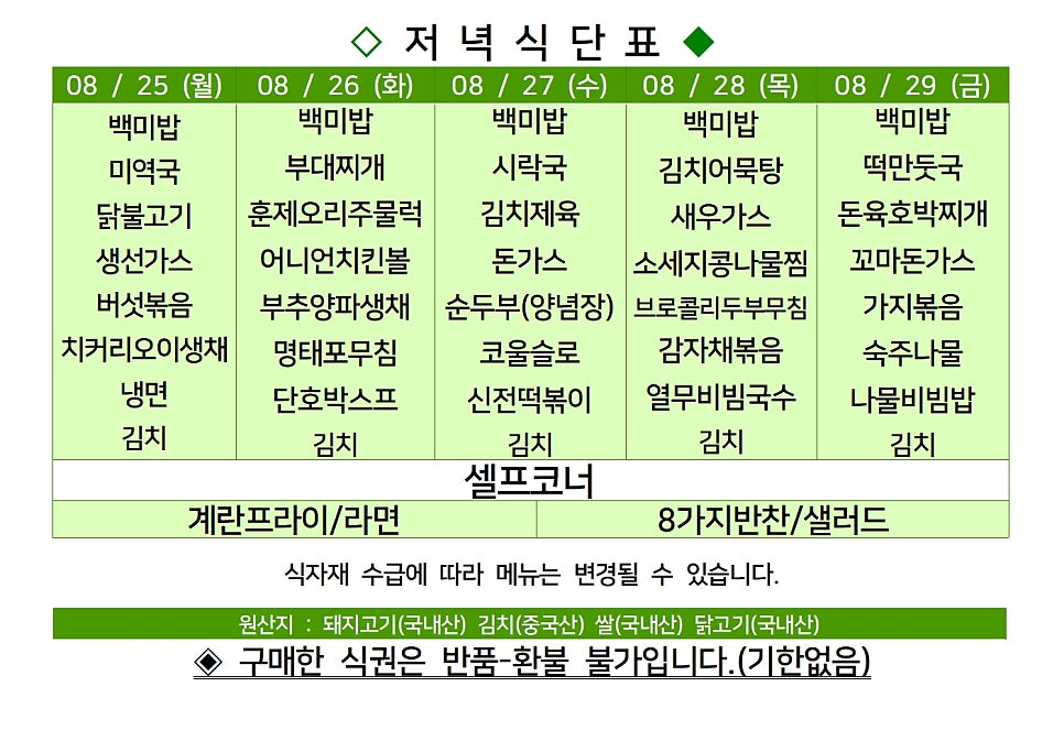 | 센텀시티 구내식당 식단표 2025년 [8월 18일 - 8월 21일] 주간 (2) | 2025.08.18 |