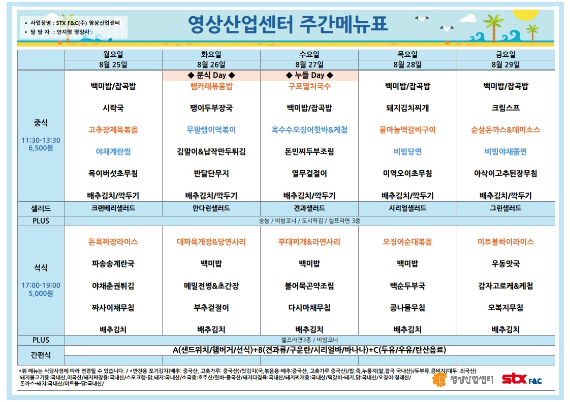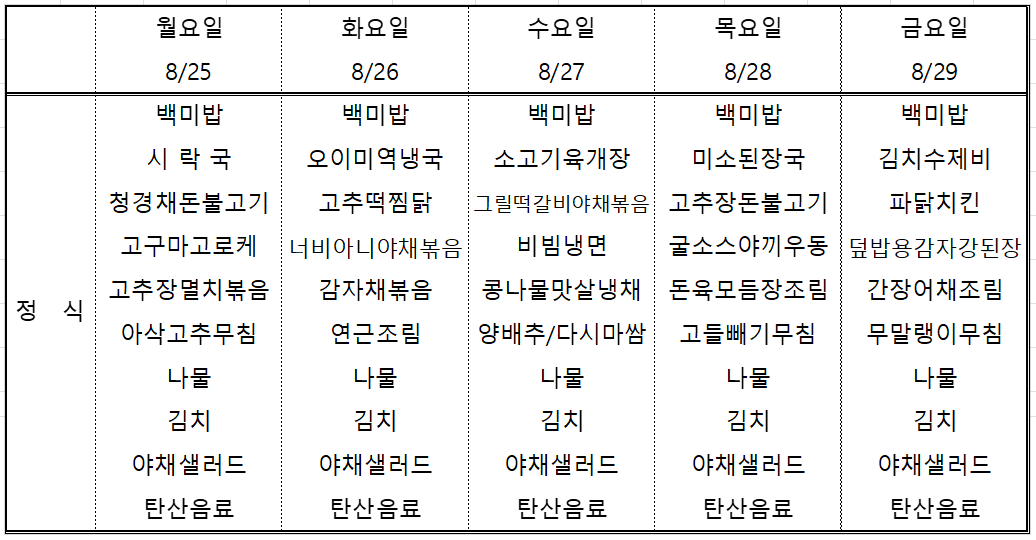| 센텀시티 구내식당 식단표 2025년 [8월 4일 - 8월 8일] 주간 (1) | 2025.08.04 |