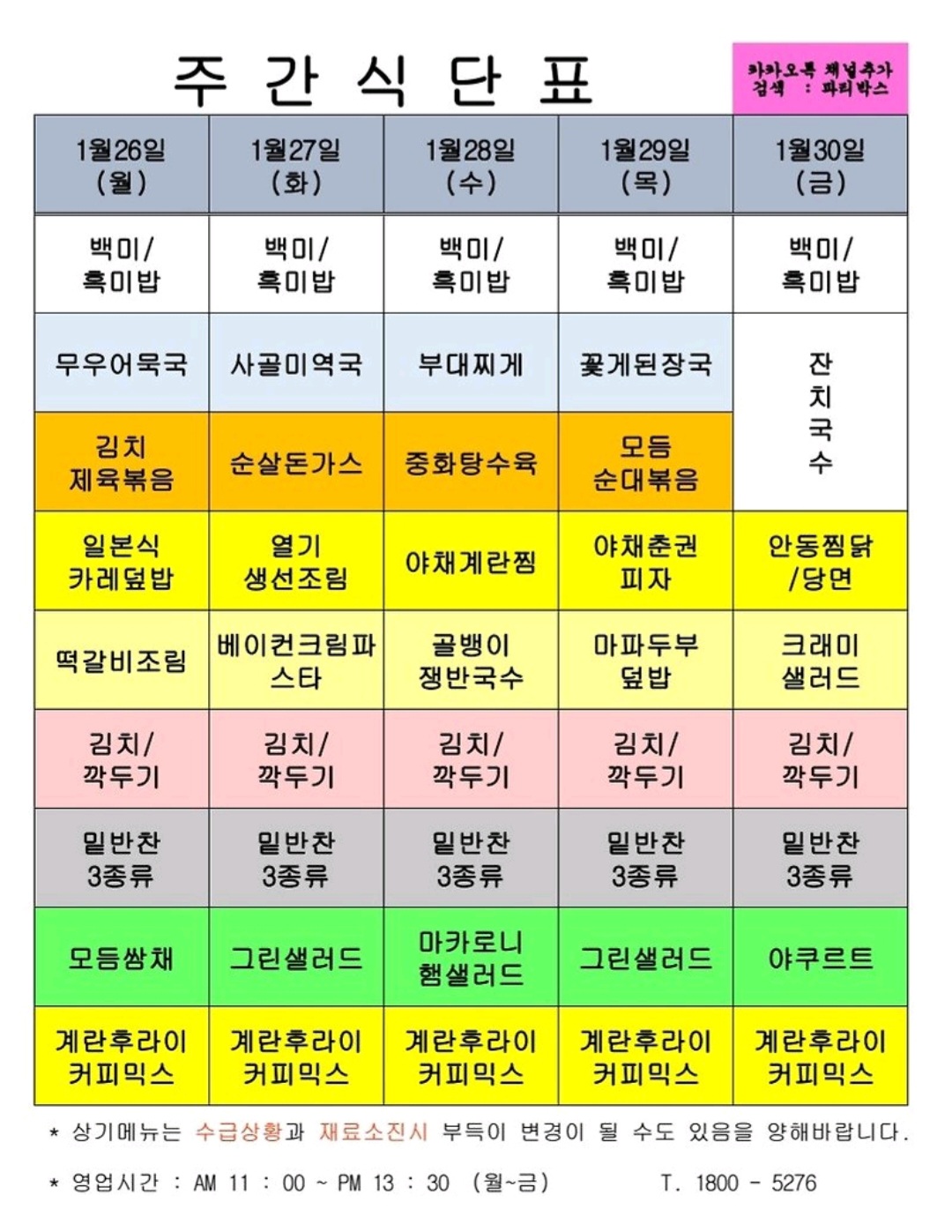 | 센텀시티 구내식당 식단표 2026년 [1월 19일 - 1월 23일] 주간 (0) | 2026.01.19 |