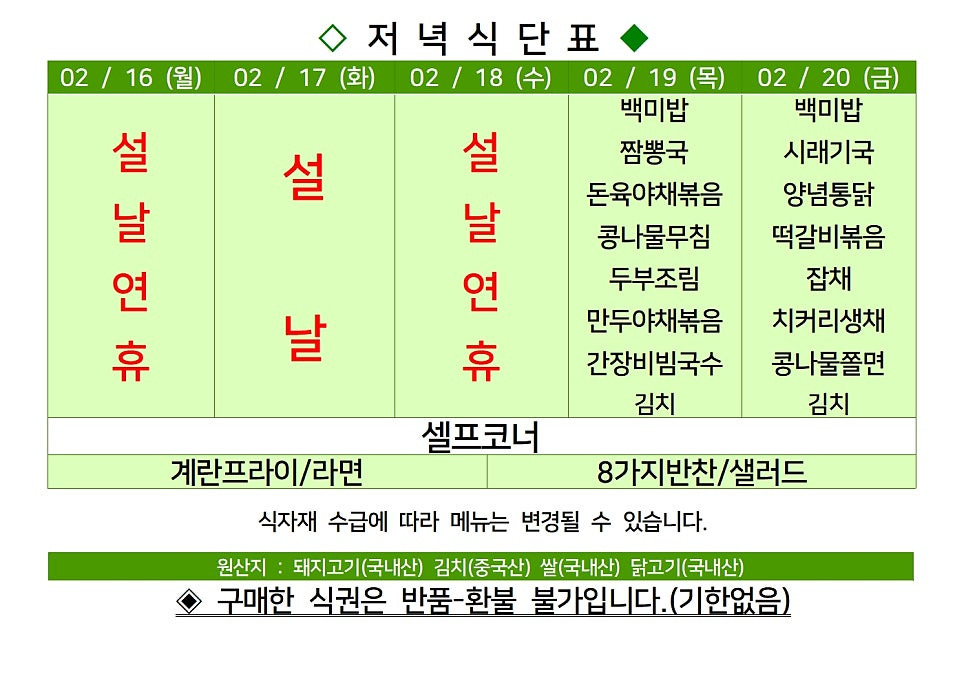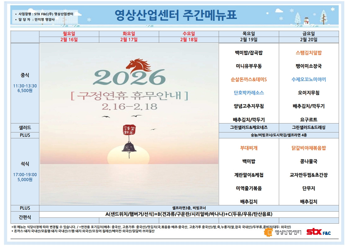 | 센텀시티 구내식당 식단표 2026년 [2월 9일 - 2월 13일] 주간 (0) | 2026.02.09 |
