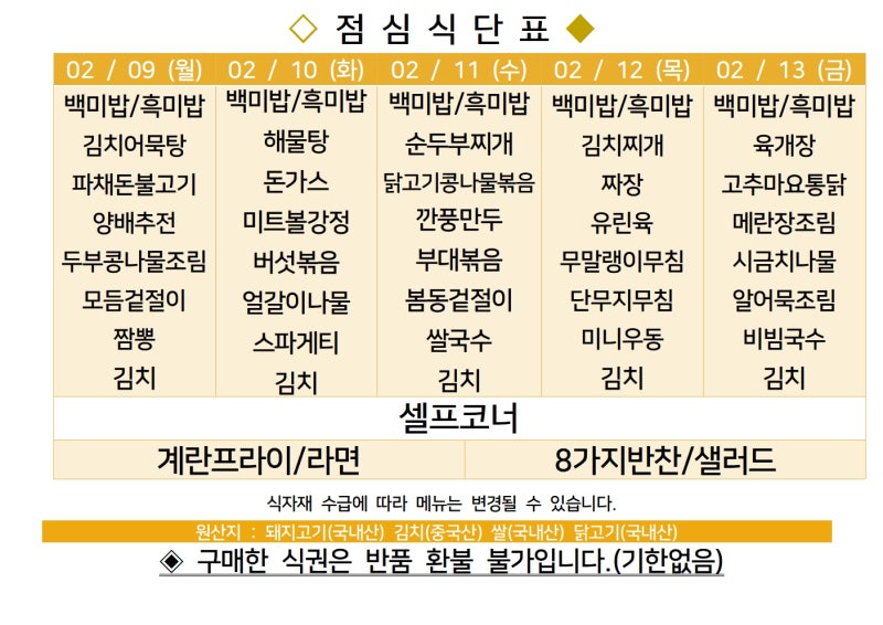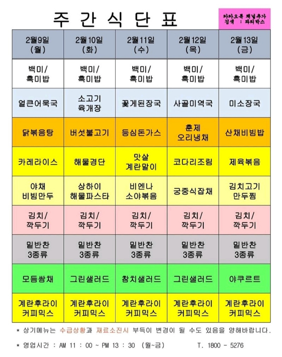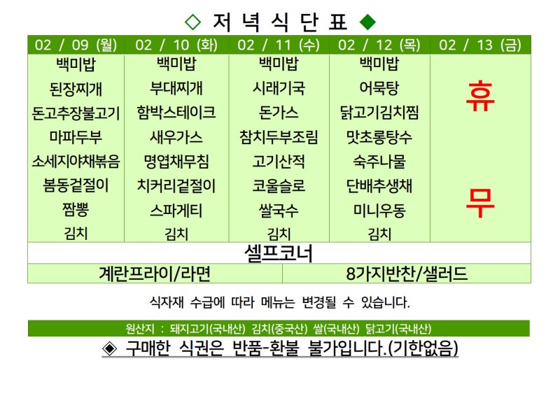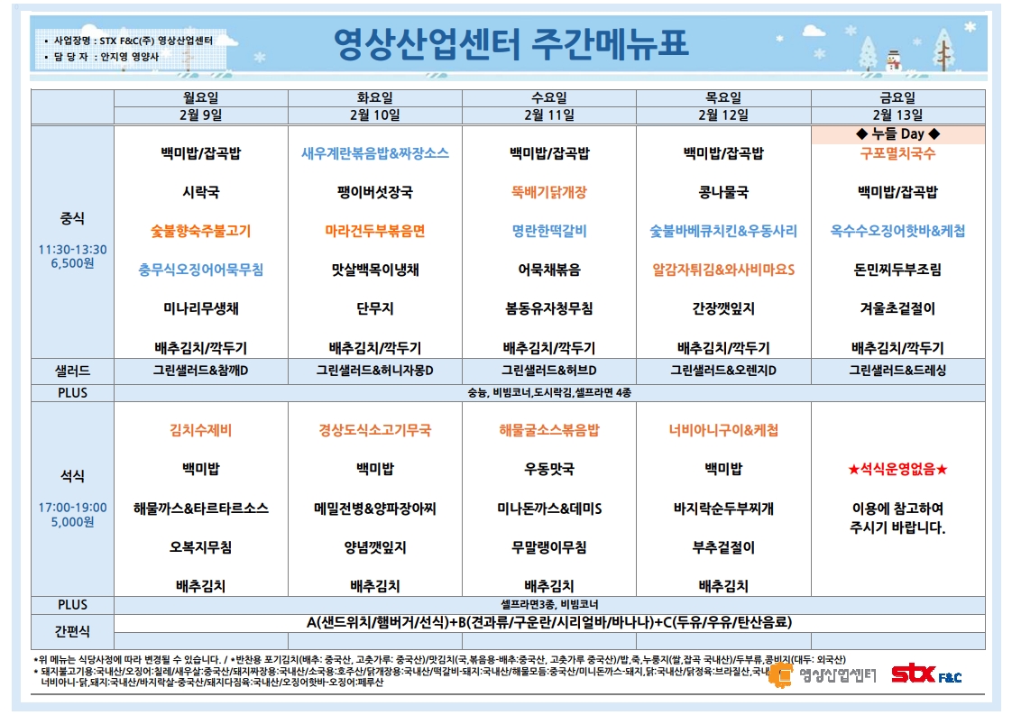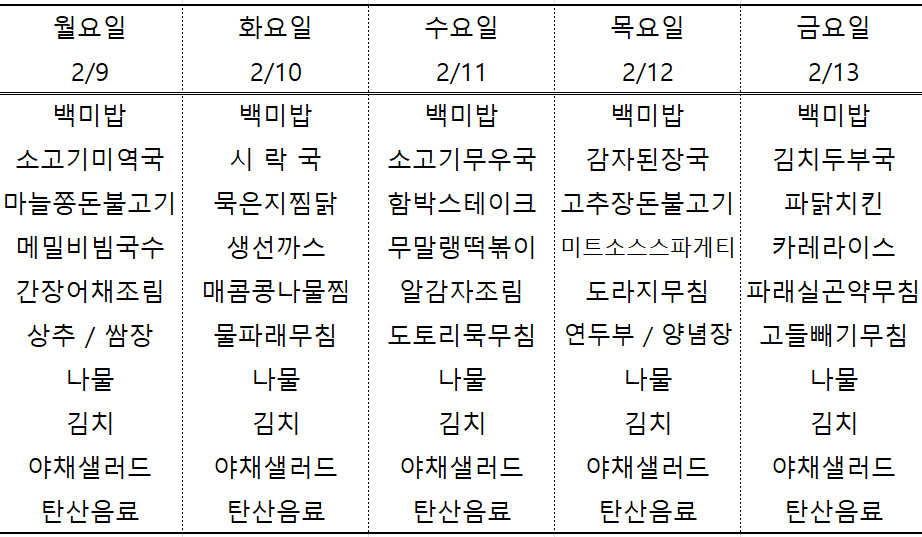 | 센텀시티 구내식당 식단표 2026년 [2월 2일 - 2월 6일] 주간 (0) | 2026.02.02 |