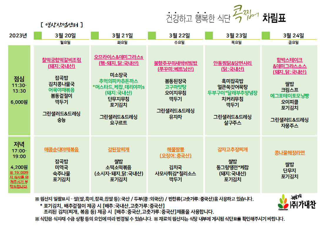 | 센텀시티 구내식당 식단표 [3월 27일 - 3월 31일] 주간 (0) | 2023.03.27 |