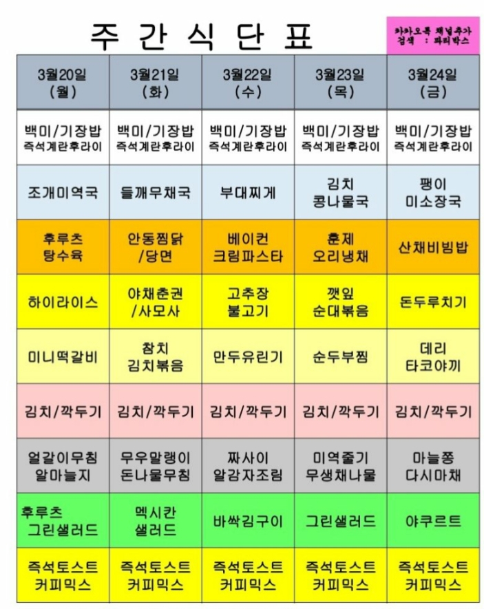 | 센텀시티 구내식당 식단표 [3월 13일 - 3월 17일] 주간 (0) | 2023.03.13 |
