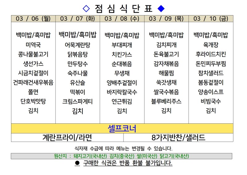 | 센텀시티 구내식당 식단표 [3월 13일 - 3월 17일] 주간 (0) | 2023.03.13 |