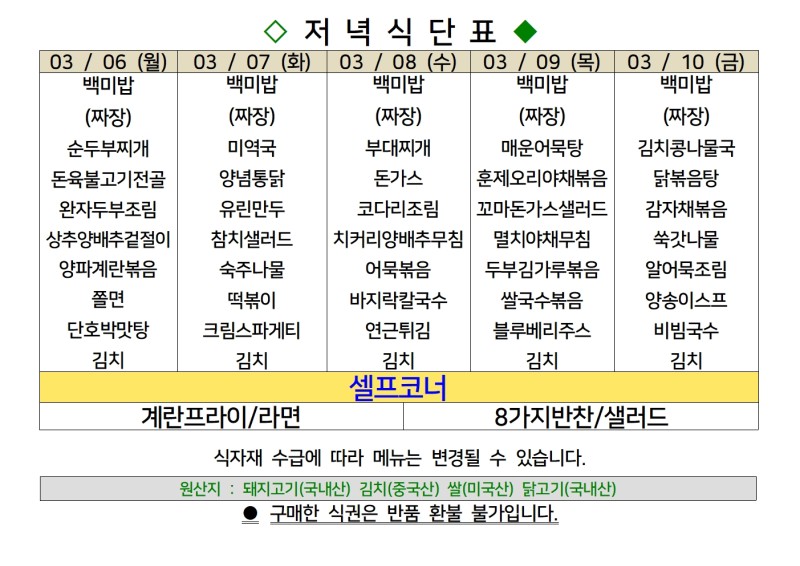 센텀시티 구내식당 식단표 [3월 6일 - 3월 10일] 주간