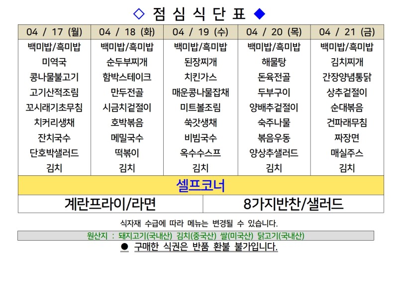 센텀시티 구내식당 식단표 [4월 3일 - 4월 7일] 주간 (0) | 2023.04.03 |