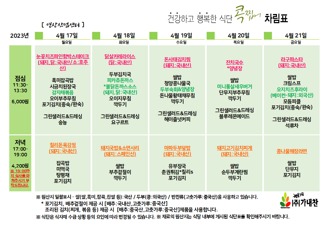 | 센텀시티 구내식당 식단표 [4월 3일 - 4월 7일] 주간 (0) | 2023.04.03 |
