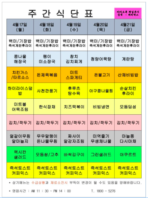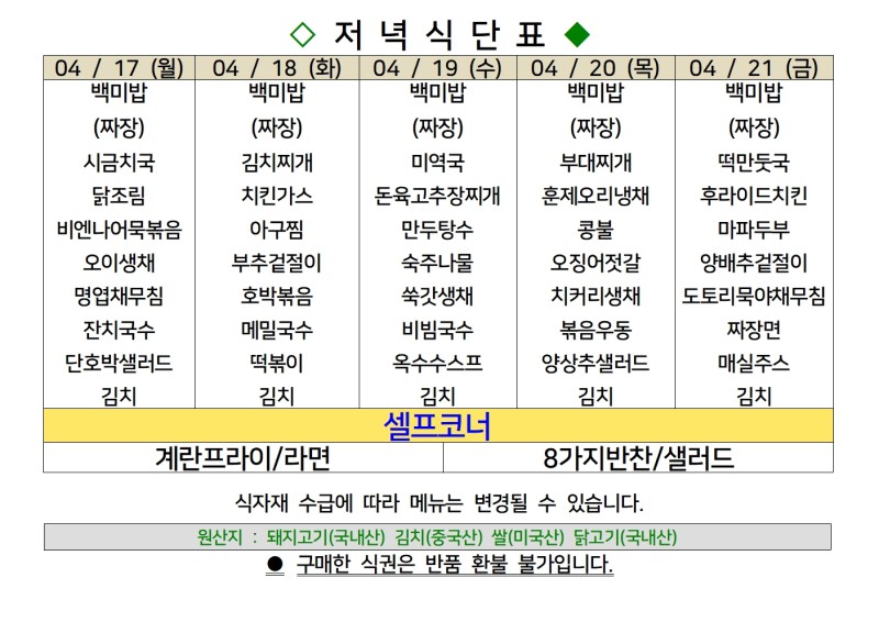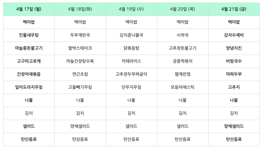 | 센텀시티 구내식당 식단표 [4월 24일 - 4월 28일] 주간 (0) | 2023.04.24 |