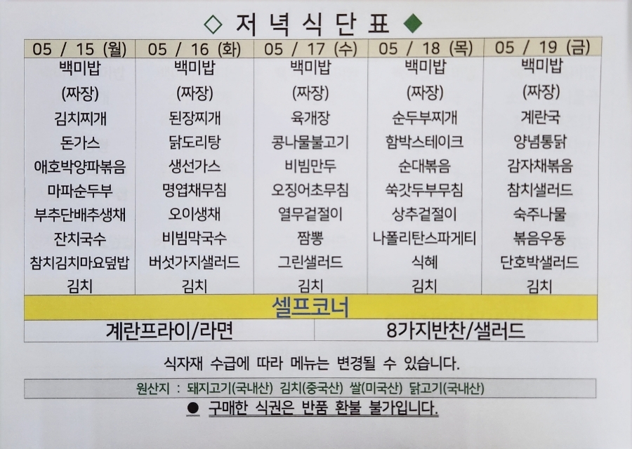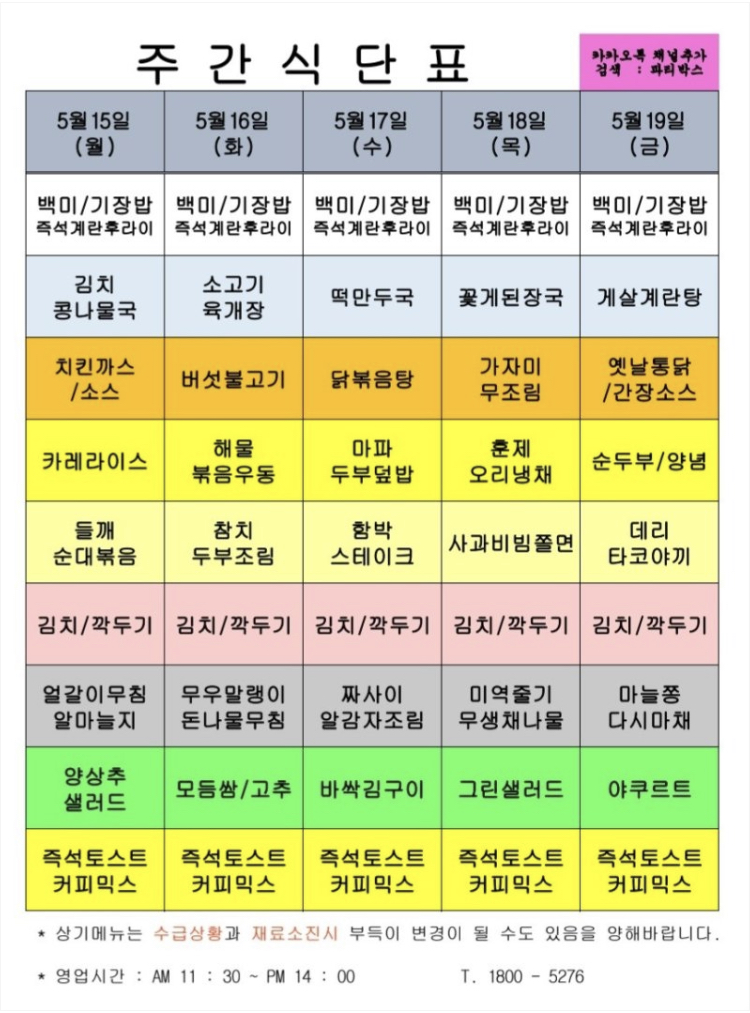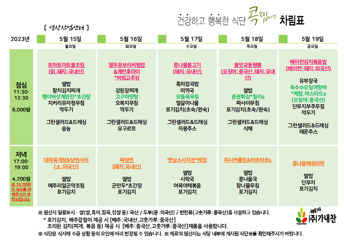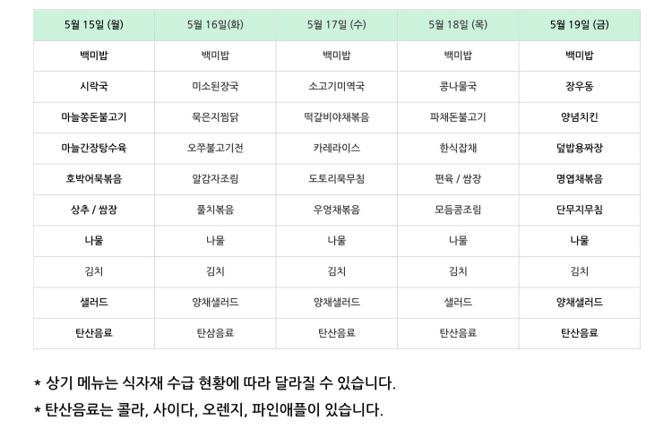 | 센텀시티 구내식당 식단표 [5월 22일 - 5월 26일] 주간 (0) | 2023.05.22 |