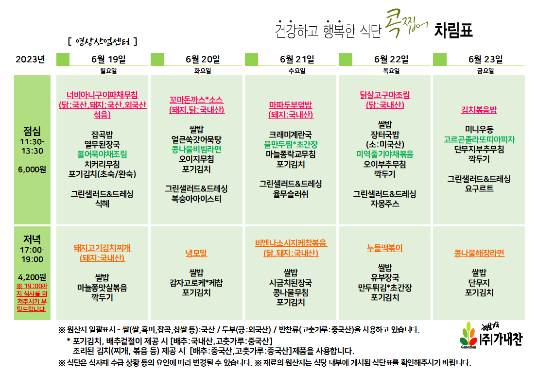 | 센텀시티 구내식당 식단표 [6월 12일 - 6월 16일] 주간 (1) | 2023.06.12 |