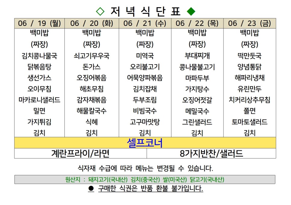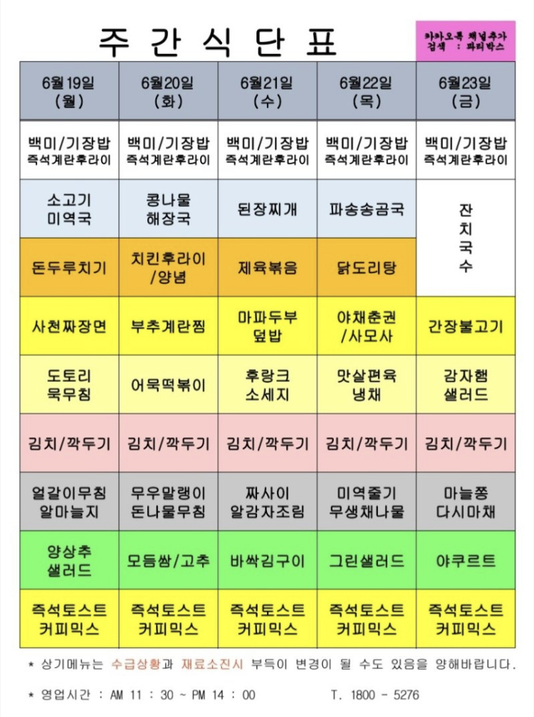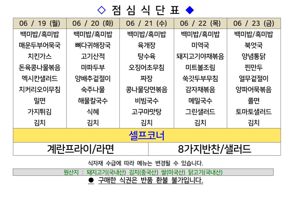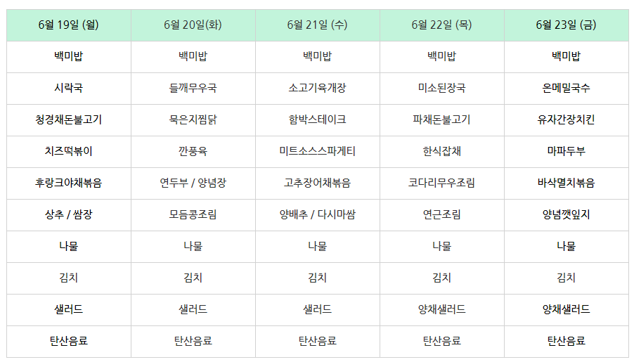 | 센텀시티 구내식당 식단표 [6월 12일 - 6월 16일] 주간 (1) | 2023.06.12 |