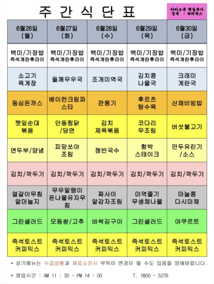 | 센텀시티 구내식당 식단표 [6월 12일 - 6월 16일] 주간 (1) | 2023.06.12 |