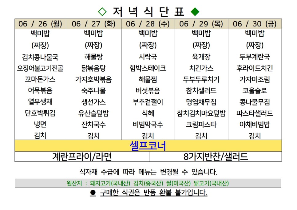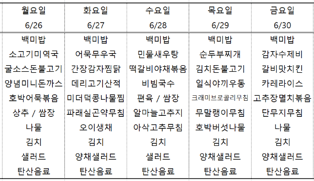 | 센텀시티 구내식당 식단표 [6월 12일 - 6월 16일] 주간 (1) | 2023.06.12 |