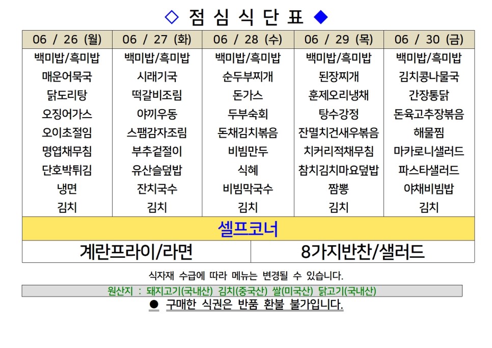 | 센텀시티 구내식당 식단표 [6월 19일 - 6월 23일] 주간 (0) | 2023.06.19 |