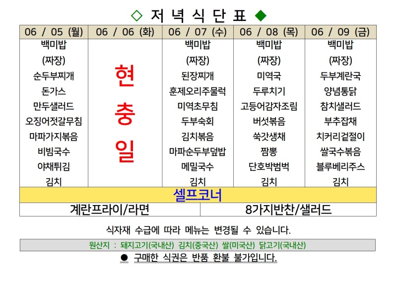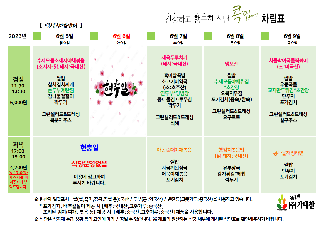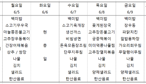 | 센텀시티 구내식당 식단표 [6월 12일 - 6월 16일] 주간 (1) | 2023.06.12 |