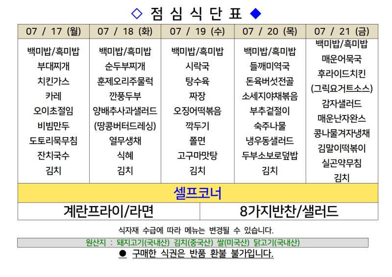 | 센텀시티 구내식당 식단표 [7월 31일 - 8월 4일] 주간 (0) | 2023.07.31 |