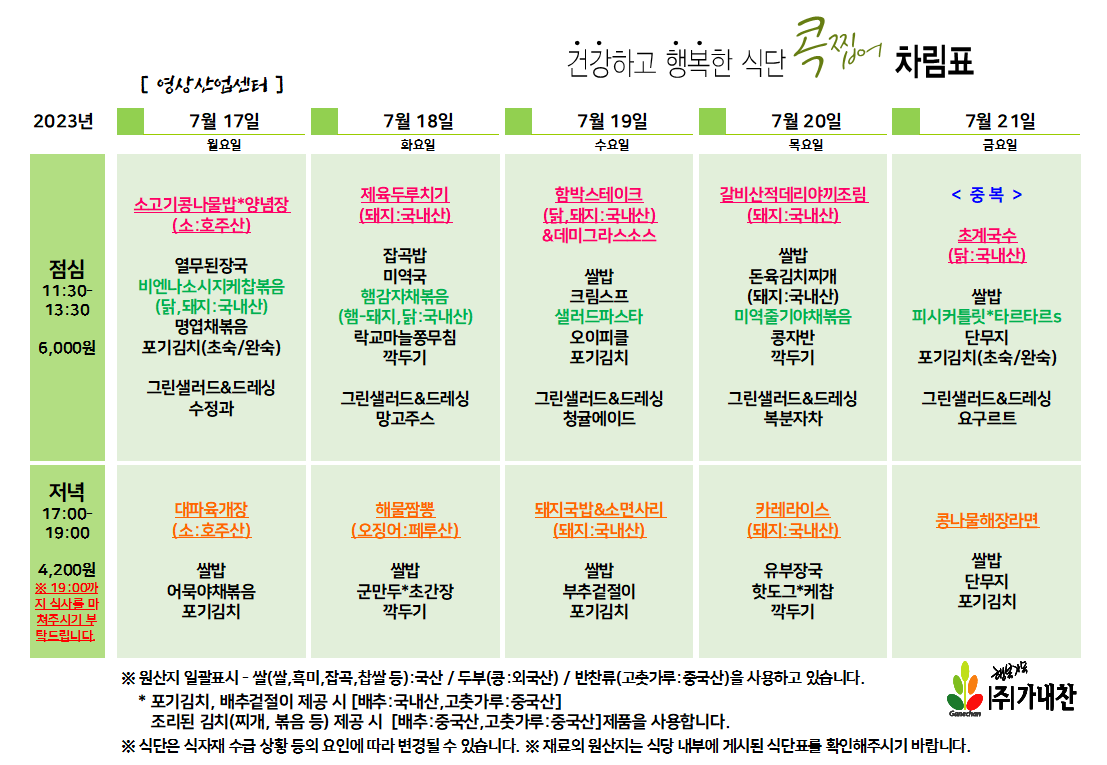 | 센텀시티 구내식당 식단표 [7월 3일 - 7월 7일] 주간 (0) | 2023.07.03 |