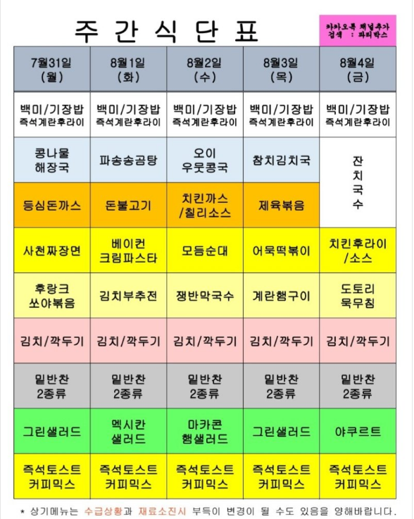 | 센텀시티 구내식당 식단표 [7월 7일 - 8월 11일] 주간 (1) | 2023.08.07 |
