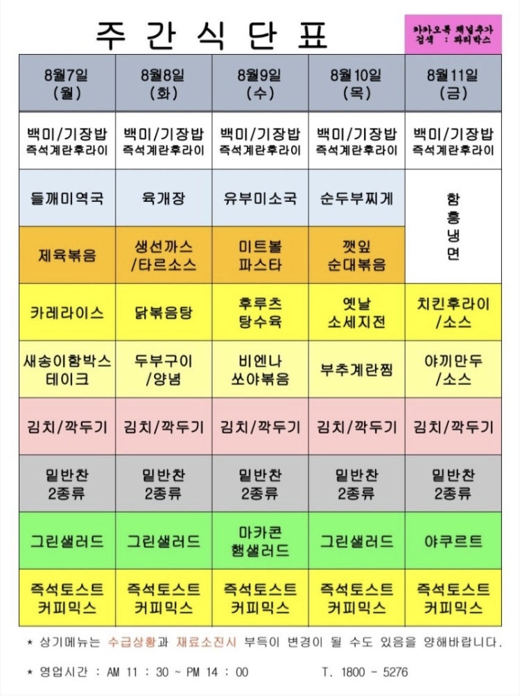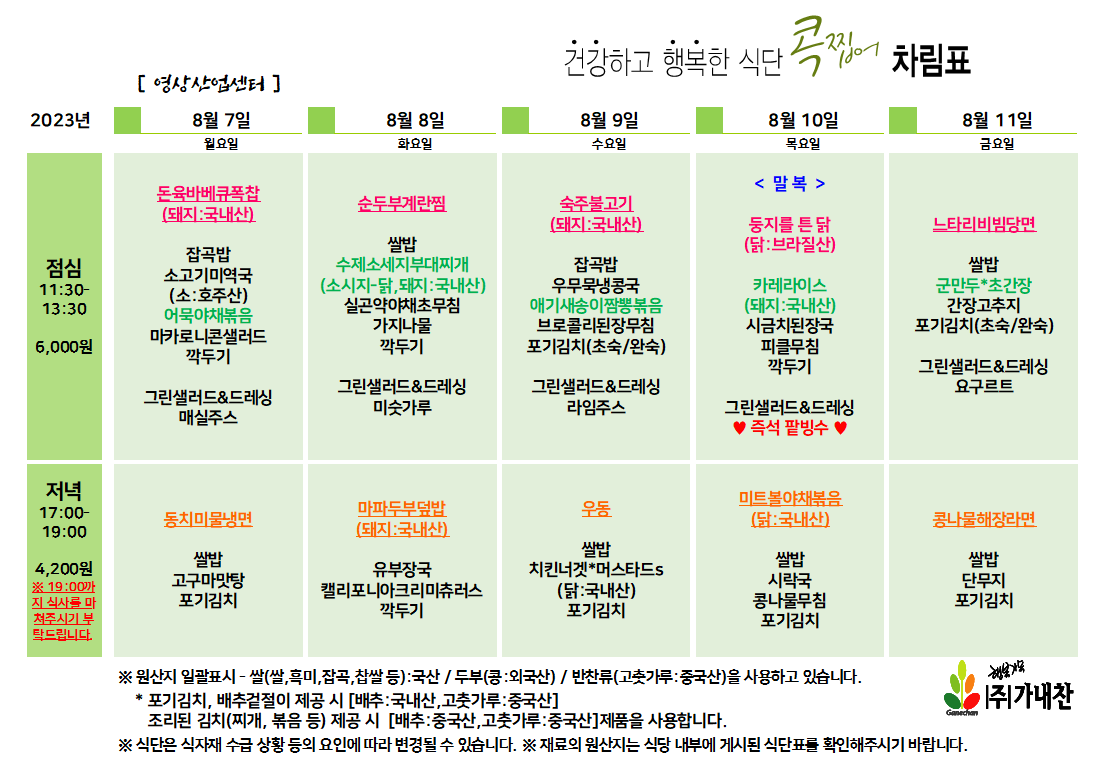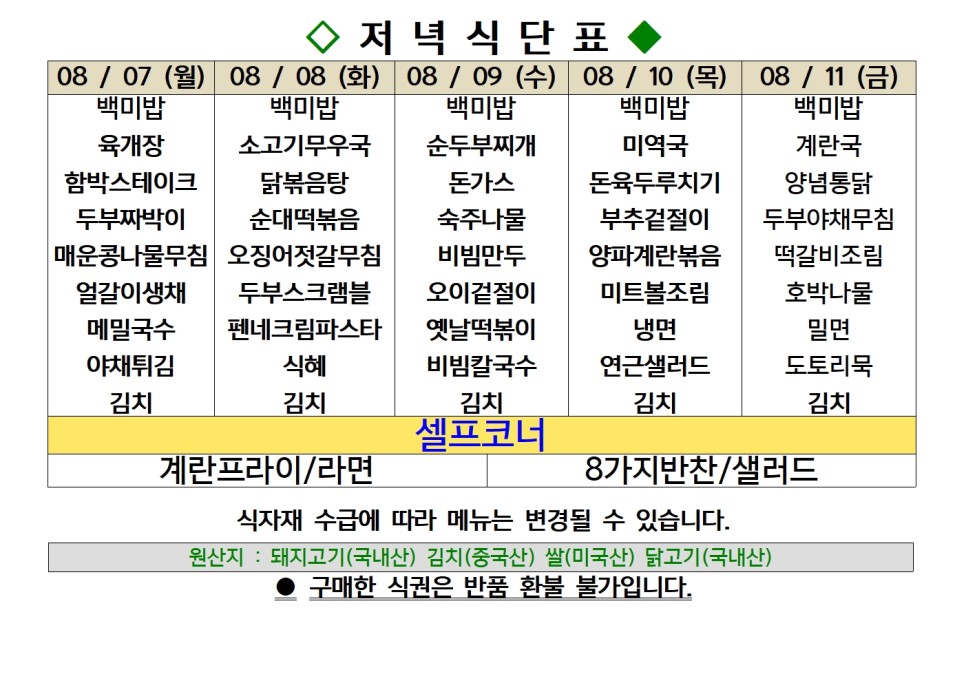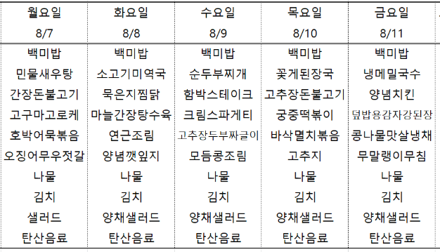 | 센텀시티 구내식당 식단표 [8월 21일 - 8월 25일] 주간 (0) | 2023.08.21 |