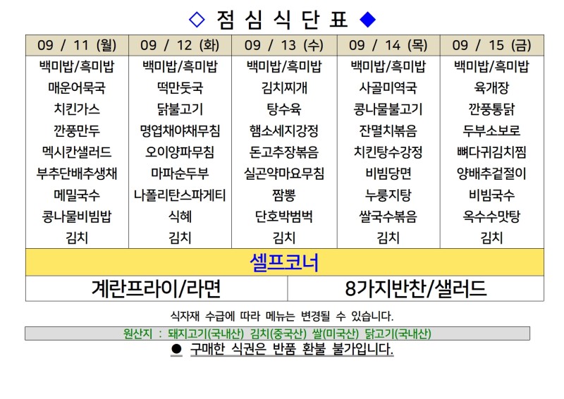 | 센텀시티 구내식당 식단표 [9월 4일 - 9월 8일] 주간 (0) | 2023.09.04 |