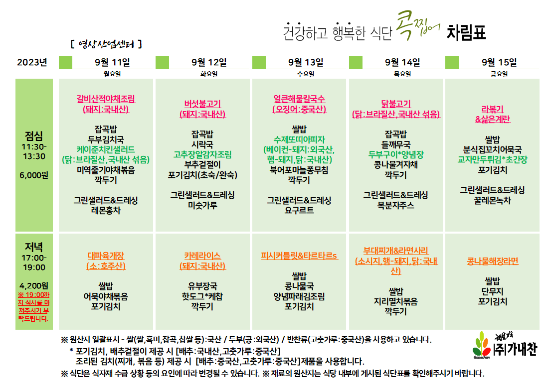 | 센텀시티 구내식당 식단표 [9월 4일 - 9월 8일] 주간 (0) | 2023.09.04 |