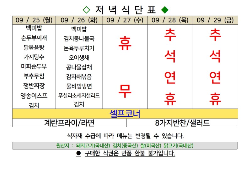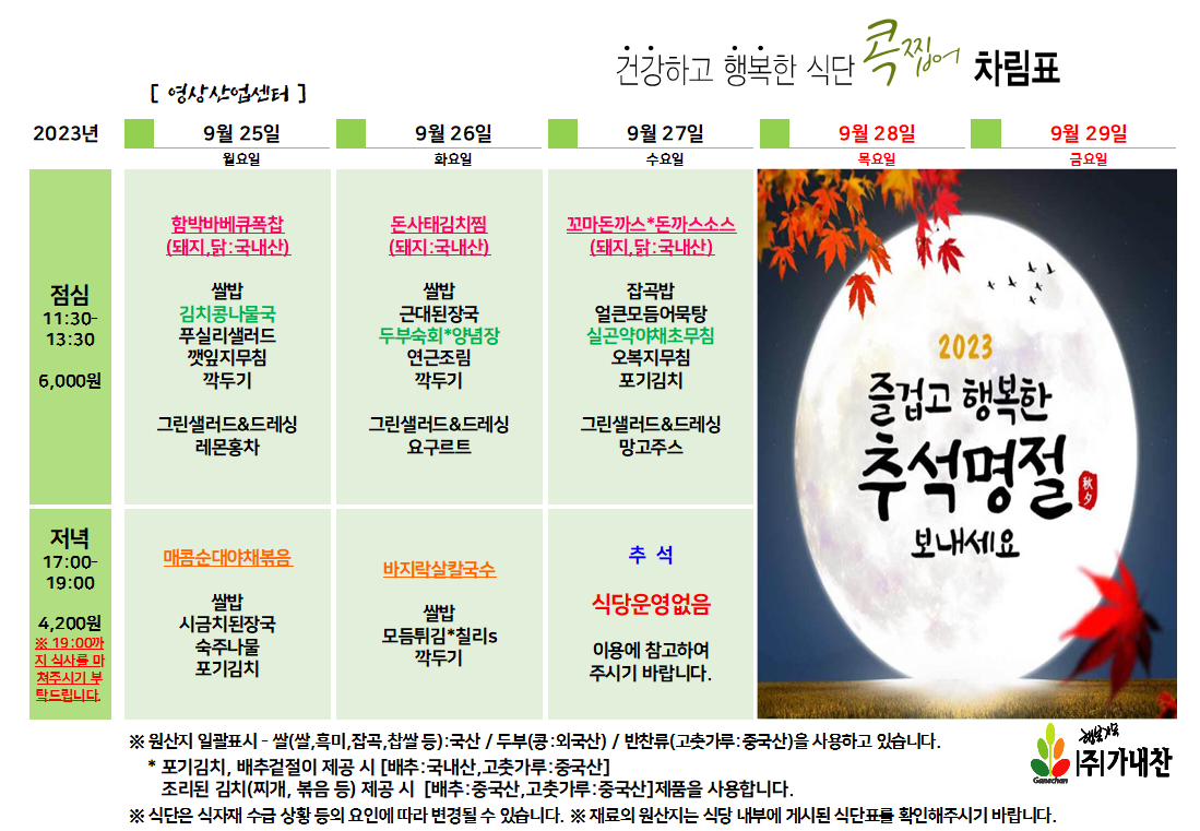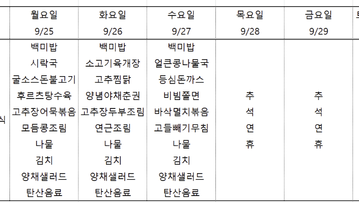 | 센텀시티 구내식당 식단표 [9월11일 - 9월 15일] 주간 (1) | 2023.09.11 |
