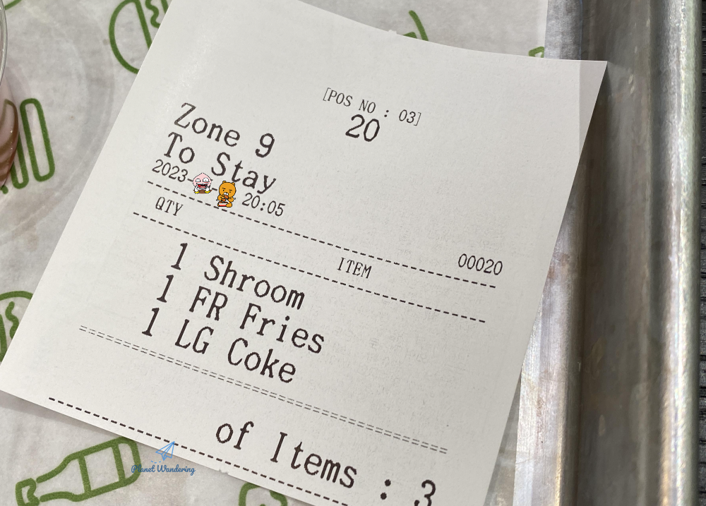 늦은 시간대라 그런지 태블릿은 모두 꺼져있고 카운터 직원분이 주문을 받습니다. 버섯이 들어있다는 슈롬버거와 감자, 콜라 라지 사이즈를 주문했습니다. 주문 즉시 조리를 하는 지 버거가 나오는 시간은 제법 걸리는 느낌입니다. 패스트푸드인 햄버거를 팔지만, 패스트하게 음식이 나오는 것 같지는 않네요. 자리를 잡고 기다리시면 진동벨이 울립니다.